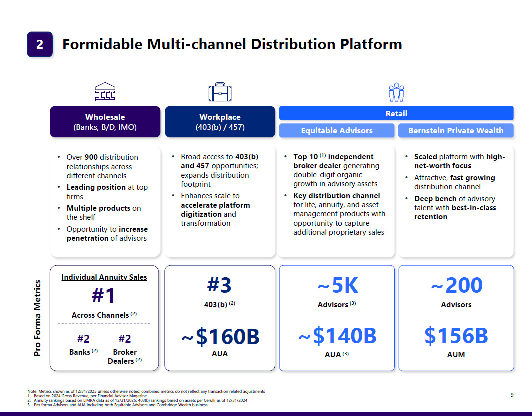 of this line #1 Life & Annuity Company by U.S. Earnings (4) 8 Leading Retirement, Life, Wealth & Asset Management Company $30B+ Adj. Book Value (8) ~440% RBC Ratio (9) Established Institutional & Life Provider #1 RILA / VA (2) #3 FA / FIA (2) #3 403(b) (2) Industry - Leading Retirement Player Enhanced Wealth & Asset Management Capabilities ~$140B Wealth AUA (1) ~$1T AB AUM (3) ~5K Advisors (1) ~$130B AUM/A Institutional Markets (1) Leading Provider in IUL, VUL and Term 1 Scaled Platform to Better Serve Customers $5B+ 2027E Run - Rate Adj. Operating Earnings (5) $500M Expense Synergies by the end of 2028 15%+ 2027E ROE (7) $4B+ 2027E Cash Generation (6) Superior Growth and Profitability Across Market Cycles ~12M Customers (1) ~$1.5T AUM/A (1) 1. Combined as of 12/31/2025 with no transaction related adjustments 2. Annuity rankings based on LIMRA data as of 12/31/2025; 403(b) rankings based on assets per Cerulli as of 12/31/2024 3. Reflects AB AUM as of December 31, 2025 plus additional AUM of $100B to be allocated by Corebridge over time 4. See appendix for detail 5. Reflects combined adjusted after - tax earnings based on consensus estimates plus run - rate synergies, excluding transaction adjustments 6. Pro forma free cash flow generation reflects annual cash flow generated from insurance dividends and non - insurance operations; based on stated guidance and consensus estimates for both companies plus run rate synergies 7. Reflects estimated pro forma ROE with Corebridge as accounting acquiror 8. Reflects Corebridge’s adjusted book value as of 12/31/2025 plus estimated equity issuance in connection with all stock merger 9. Reflects combined NAIC RBC ratios for Corebridge and Equitable U.S. insurance companies as of 12/31/2025