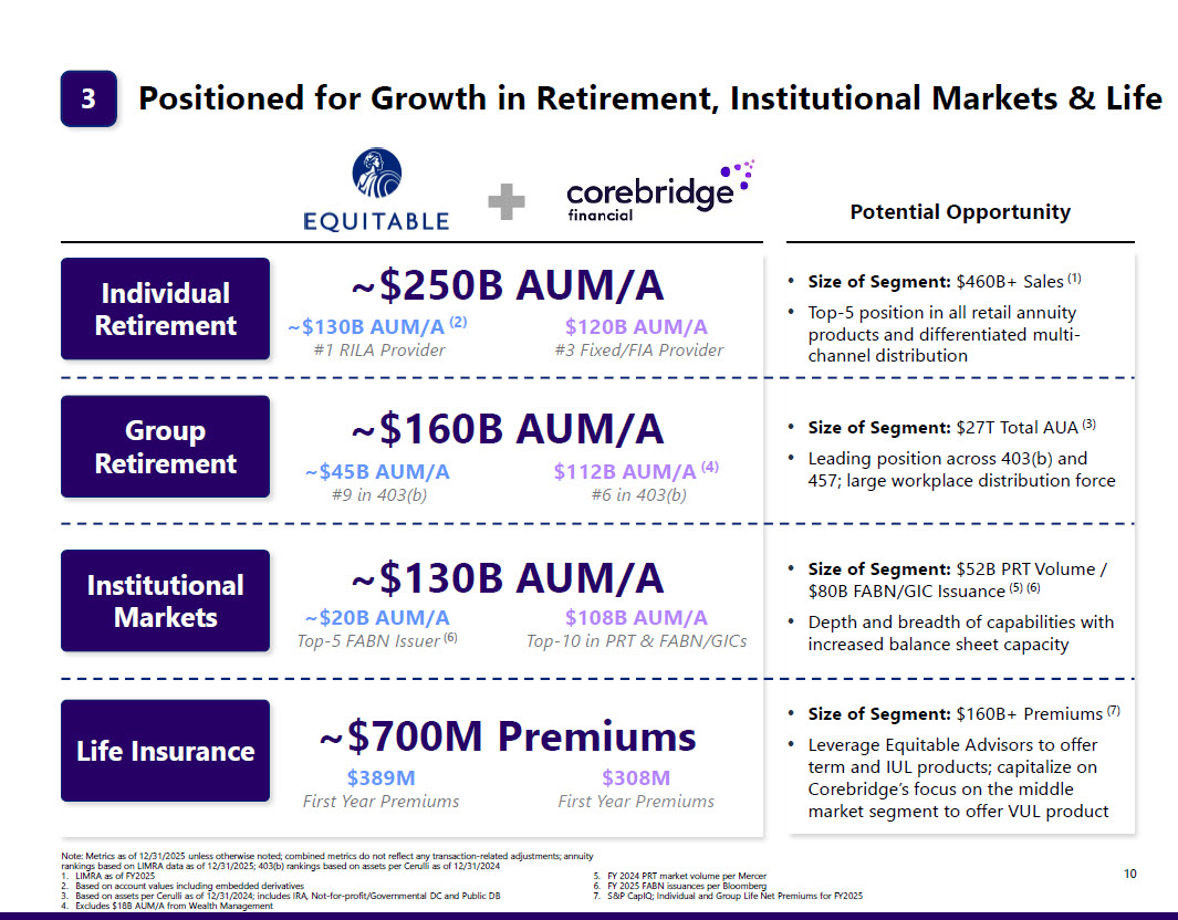 of this line Note: Metrics shown as of 12/31/2025 unless otherwise noted; combined metrics do not reflect any transaction related adjustme nts 1. Based on 2024 Gross Revenue, per Financial Advisor Magazine 2. Annuity rankings based on LIMRA data as of 12/31/2025; 403(b) rankings based on assets per Cerulli as of 12/31/2024 3. Pro forma Advisors and AUA including both Equitable Advisors and Corebridge Wealth business • Broad access to 403(b) and 457 opportunities; expands distribution footprint • Enhances scale to accelerate platform digitization and transformation • Over 900 distribution relationships across different channels • Leading position at top firms • Multiple products on the shelf • Opportunity to increase penetration of advisors • Top 10 (1) independent broker dealer generating double - digit organic growth in advisory assets • Key distribution channel for life, annuity, and asset management products with opportunity to capture additional proprietary sales 9 Formidable Multi - channel Distribution Platform Pro Forma Metrics Workplace (403(b) / 457) Wholesale (Banks, B/D, IMO) Retail #3 403(b) (2) ~$160B AUA ~5K Advisors (3) ~$140B AUA (3) 2 #2 Banks (2) #1 Across Channels (2) #2 Broker Dealers (2) Equitable Advisors • Scaled platform with high - net - worth focus • Attractive, fast growing distribution channel • Deep bench of advisory talent with best - in - class retention Bernstein Private Wealth $156B AUM ~200 Advisors Individual Annuity Sales