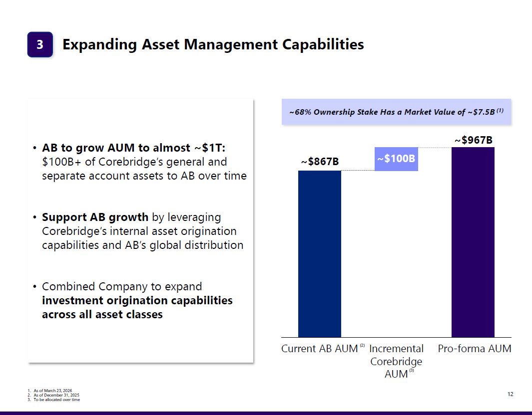 of this line 12 Expanding Asset Management Capabilities 3 • AB to grow AUM to almost ~$1T: $100B+ of Corebridge’s general and separate account assets to AB over time • Support AB growth by leveraging Corebridge’s internal asset origination capabilities and AB’s global distribution • Combined Company to expand investment origination capabilities across all asset classes Current AB AUM Incremental Corebridge AUM Pro - forma AUM ~$ 100 B ~$ 867 B ~$ 967 B ~68% Ownership Stake Has a Market Value of ~$7.5B (1) (2) (3) 1. As of March 23, 2026 2. As of December 31, 2025 3. To be allocated over time