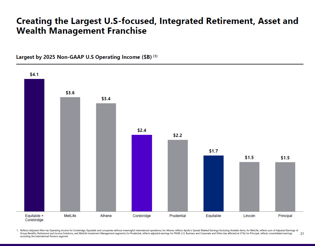 of this line 2 Cautionary Statement Regarding Forward - Looking Information This communication includes statements, which, to the extent they are not statements of historical or present fact, constitut e “ forward looking statements” within the meaning of the U.S. Private Securities Litigation Reform Act of 1995. Forward - looking statements, and any related oral statements, can be identified by the use of terms such as “believes,” “expects,” “may,” “will,” “shall,” “should,” “would,” “could,” “seeks,” “aims,” “projects,” “forecasts,” “intends,” “targets,” “plans,” “estimates,” “anticipates,” “goals ,” “guidance,” “formidable,” “preliminary,” “objective,” “continue,” “drive,” “improve,” “superior,” “robust,” “positioned,” “resilient,” “vision,” “potential,” “immediate,” and similar expressions or the negative of those expressions or verbs. We caution you that forward - looking statements are not guarantees of future performance or outcomes. Forward - looking statements are not historical facts but instead represent only our beliefs regarding future events, which may by their nature be inherently uncertain, and some of which may be outside our control. These statements include, but are not limited to, stateme nts about the expected timing and completion of the proposed transaction between Corebridge and Equitable (the “Proposed Transaction”), the anticipated benefits of the Proposed Transaction, including estimated synergi es and projected cost savings, and plans and expectations for Corebridge , Equitable or their new parent company after completion of the Proposed Transaction. Such forward - looking statements are subject to known and unknown risks, uncertainties, assumptions and other factors that may ca use the actual results, level of activity, performance or achievements to be materially different from those expressed or implied by such forward - looking statements. Key factors include, among others, the ability to complete the Proposed Transaction on the timeframe or on the terms currently anticipated or at all, including due to a failure to obtain requisite stockholder, st ock exchange, regulatory, governmental or other approvals; risks related to difficulties, inabilities or delays in integrating the parties’ businesses; the ability to realize the anticipated benefits o f t he Proposed Transaction, including estimated run - rate expense synergies and projected cost savings at the times, and to the extent, anticipated, as well as expected operating earning and cashflow gener ati on; the occurrence of any event, change or other circumstance that could give rise to the right of either or both parties to terminate the merger agreement; the potential impact of the announc eme nt or consummation of the Proposed Transaction on Corebridge or Equitable’s stock price and on their respective business, contractual and operational relationships (including with regulatory bodies, em pl oyees, suppliers, clients and competitors); risks related to business disruptions from the Proposed Transaction that may harm the business or current plans and operations of either or bo th parties, including diversion of management time from ongoing business operations; the risk that the Proposed Transaction and its announcement could have an adverse effect on the ability of either or both parties to hire and retain key personnel; the parties’ ability to raise debt on favorable terms or at all; the outcome of any legal proceedings that may be instituted against Corebridge , Equitable, their new parent company or their respective directors; restrictions on the conduct of Corebridge and Equitable’s respective businesses prior to the closing of the Proposed Transaction and on each their ability to pursue alternatives to th e Proposed Transaction; the possibility that the Proposed Transaction may be more expensive to complete than anticipated, including as a re sult of unexpected factors or events, or unforeseen or unknown liabilities; the deterioration of economic conditions; geopolitical tensions; the potential impact of a downgrade in Corebridge or Equitable’s Insurer Financial Strength ratings or credit ratings or of the new parent company of Corebridge and Equitable following completion of the Proposed Transaction; other factors that may affect future results of Corebridge and Equitable; and management’s response to any of the aforementioned factors. The foregoing list of factors is not exhaustive. You should carefully consider these factors and the other risks and uncertai nti es described in the “Risk Factors” section of the new parent company’s Registration Statement on Form S - 4 discussed below and other documents filed or furnished by Corebridge and Equitable from time to time with the U.S. Securities and Exchange Commission (the “SEC”), including their Annual Reports on Form 10 - K for the year ended December 31, 2025. These filings identify and address oth er important risks and uncertainties that could cause actual events and results to differ materially from those contained in the forward - looking statements. If any of these risks materialize or ou r assumptions prove incorrect, actual events and results could differ materially from those contained in the forward - looking statements. There may be additional risks that neither Corebridge nor Equitable presently know or that Corebridge and Equitable currently believe are immaterial that could also cause actual events and results to differ materially from those contained in the forwa rd - looking statements. In addition, forward - looking statements reflect Corebridge and Equitable’s expectations, plans or forecasts of future events and views as of the date of this communication. Corebridge and Equitable anticipate that subsequent events and developments will cause Corebridge and Equitable’s 