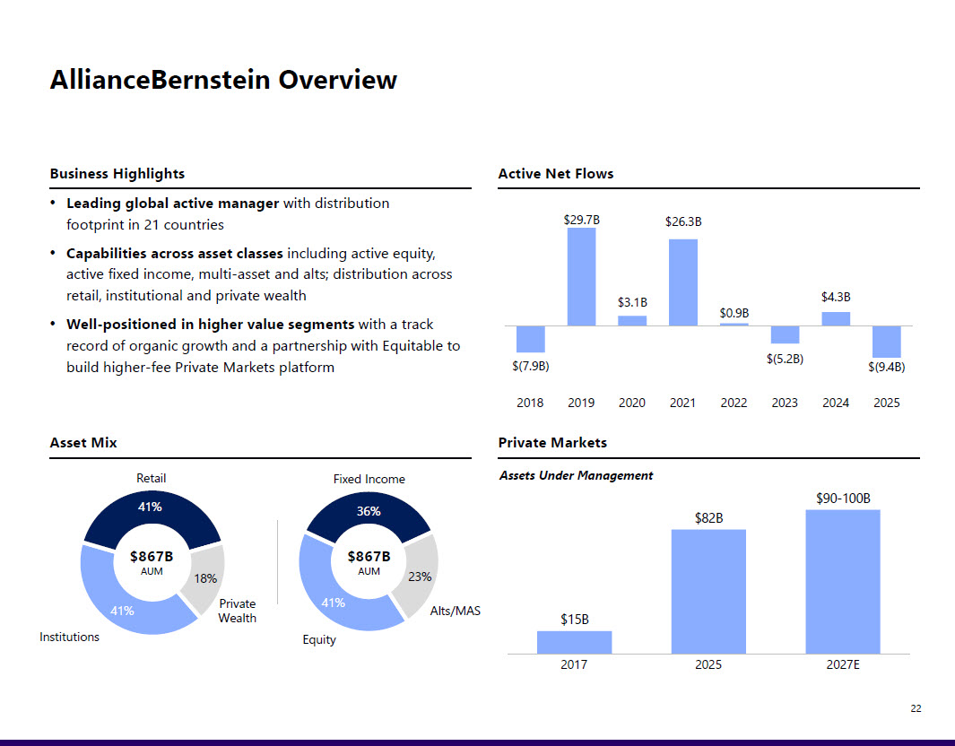 of this line 22 AllianceBernstein Overview Business Highlights Active Net Flows Private Markets • Leading global active manager with distribution footprint in 21 countries • Capabilities across asset classes including active equity, active fixed income, multi - asset and alts; distribution across retail, institutional and private wealth • Well - positioned in higher value segments with a track record of organic growth and a partnership with Equitable to build higher - fee Private Markets platform $(7.9B) $29.7B $3.1B $26.3B $0.9B $(5.2B) $4.3B $(9.4B) 2018 2019 2020 2021 2022 2023 2024 2025 $15B $82B $90 - 100B 2027E 2025 2017 41% 41% 18% 41% 36% 23% $867B AUM $867B AUM Institutions Equity Private Wealth Alts/MAS Assets Under Management Retail Fixed Income Asset Mix