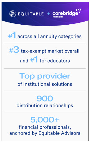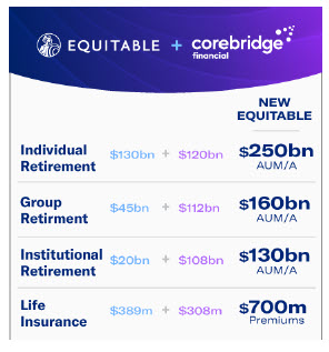 Equitable and Corebridge have complementary strengths. Corebridge has a leading position in fixed and indexed annuities, a meaningful life insurance business and serves employees in healthcare, government, K-12 schools and higher education institutions. Corebridge also has an established institutional business including in the high-growth pension risk transfer market.