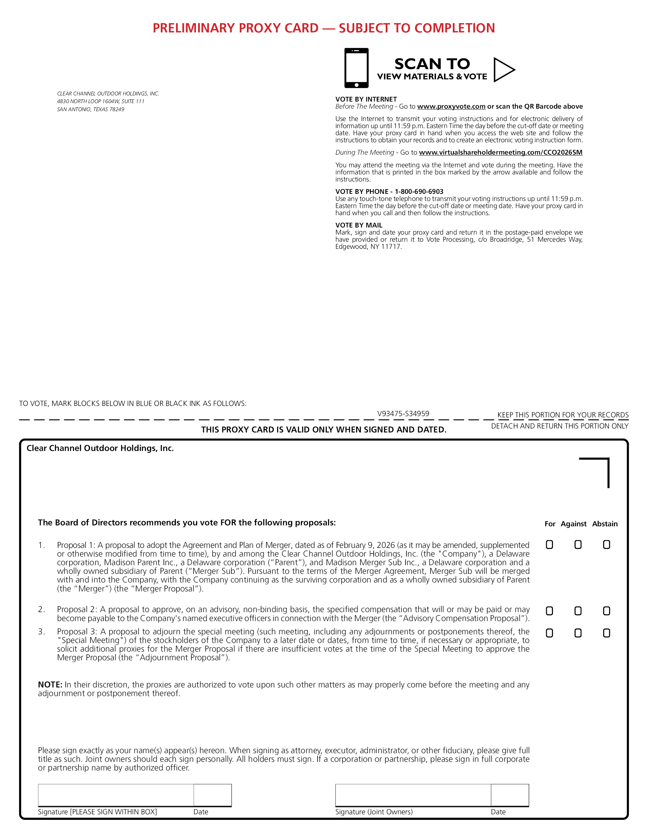 SCAN TO VIEW MATERIALS & VOTE CLEAR CHANNEL OUTDOOR HOLDINGS, INC. 4830 NORTH LOOP 1604W, SUITE 111 SAN ANTONIO, TEXAS 78249 VOTE BY INTERNET Before The Meeting - Go to www.proxyvote.com or scan the QR Barcode above Use the Internet to transmit your voting instructions and for electronic delivery of information up until 11:59 p.m. Eastern Time the day before the cut-off date or meeting date. Have your proxy card in hand when you access the web site and follow the instructions to obtain your records and to create an electronic voting instruction form. During The Meeting - Go to www.virtualshareholdermeeting.com/CCO2026SM You may attend the meeting via the Internet and vote during the meeting. Have the information that is printed in the box marked by the arrow available and follow the instructions. VOTE BY PHONE - 1-800-690-6903 Use any touch-tone telephone to transmit your voting instructions up until 11:59 p.m. Eastern Time the day before the cut-off date or meeting date. Have your proxy card in hand when you call and then follow the instructions. VOTE BY MAIL Mark, sign PRELIMINARY PROXY CARD – SUBJECT TO COMPLETION and date your proxy card and return it in the postage-paid envelope we have provided or return it to Vote Processing, c/o Broadridge, 51 Mercedes Way, Edgewood, NY 11717. TO VOTE, MARK BLOCKS BELOW IN BLUE OR BLACK INK AS FOLLOWS: KEEP THIS PORTION FOR YOUR RECORDS THIS PROXY CARD IS VALID ONLY WHEN SIGNED AND DATED. DETACH AND RETURN THIS PORTION ONLY V93475-S34959 Clear Channel Outdoor Holdings, Inc. The Board of Directors recommends you vote FOR the following proposals: For Against Abstain 1. Proposal 1: A proposal to adopt the Agreement and Plan of Merger, dated as of February 9, 2026 (as it may be amended, supplemented or otherwise modified from time to time), by and among the Clear Channel Outdoor Holdings, Inc. (the “Company”), a Delaware corporation, Madison Parent Inc., a Delaware corporation (“Parent”), and Madison Merger Sub Inc., a Delaware corporation and a wholly owned subsidiary of Parent (“Merger Sub”). Pursuant to the terms of the Merger Agreement, Merger Sub will be merged with and into the Company, with the Company continuing as the surviving corporation and as a wholly owned subsidiary of Parent (the “Merger”) (the “Merger Proposal”). 2. Proposal 2: A proposal to approve, on an advisory, non-binding basis, the specified compensation that will or may be paid or may become payable to the Company’s named executive officers in connection with the Merger (the “Advisory Compensation Proposal”). 3. Proposal 3: A proposal to adjourn the special meeting (such meeting, including any adjournments or postponements thereof, the “Special Meeting”) of the stockholders of the Company to a later date or dates, from time to time, if necessary or appropriate, to solicit additional proxies for the Merger Proposal if there are insufficient votes at the time of the Special Meeting to approve the Merger Proposal (the “Adjournment Proposal”). NOTE: In their discretion, the proxies are authorized to vote upon such other matters as may properly come before the meeting and any adjournment or postponement thereof. Please sign exactly as your name(s) appear(s) hereon. When signing as attorney, executor, administrator, or other fiduciary, please give full title as such. Joint owners should each sign personally. All holders must sign. If a corporation or partnership, please sign in full corporate or partnership name by authorized officer. Signature [PLEASE SIGN WITHIN BOX] Date Signature (Joint Owners) Date