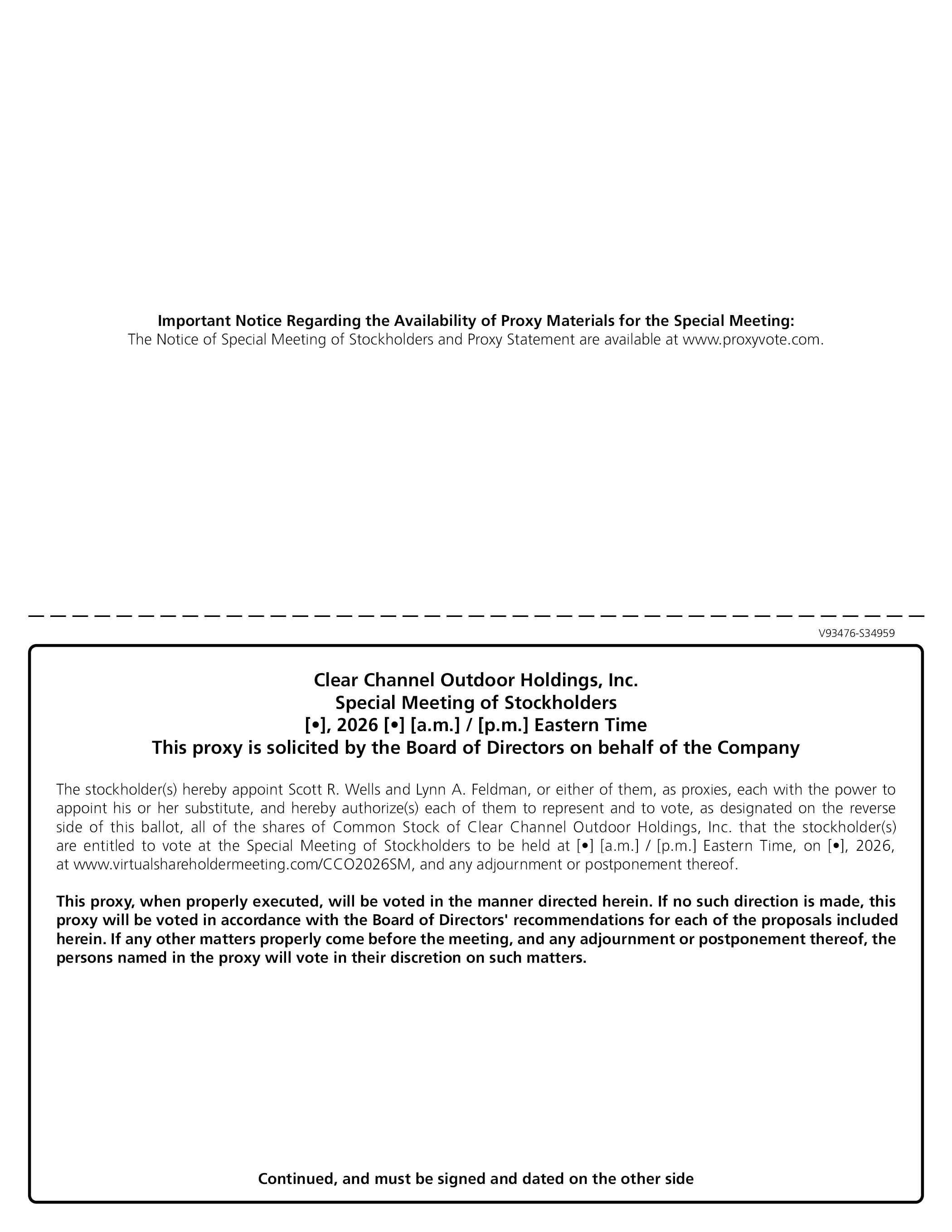 Important Notice Regarding the Availability of Proxy Materials for the Special Meeting: The Notice of Special Meeting of Stockholders and Proxy Statement are available at www.proxyvote.com.V93476-S34959 Clear Channel Outdoor Holdings, Inc. Special Meeting of Stockholders[•], 2026 [•] [a.m.] / [p.m.] Eastern Time This proxy is solicited by the Board of Directors on behalf of the Company The stockholder(s) hereby appoint Scott R. Wells and Lynn A. Feldman, or either of them, as proxies, each with the power to appoint his or her substitute, and hereby authorize(s) each of them to represent and to vote, as designated on the reverse side of this ballot, all of the shares of Common Stock of Clear Channel Outdoor Holdings, Inc. that the stockholder(s) are entitled to vote at the Special Meeting of Stockholders to be held at [•] [a.m.] / [p.m.] Eastern Time, on [•], 2026, at www.virtualshareholdermeeting.com/CCO2026SM, and any adjournment or postponement thereof. This proxy, when properly executed, will be voted in the manner directed herein. If no such direction is made, this proxy will be voted in accordance with the Board of Directors’ recommendations for each of the proposals included herein. If any other matters properly come before the meeting, and any adjournment or postponement thereof, the persons named in the proxy will vote in their discretion on such matters. Continued, and must be signed and dated on the other side