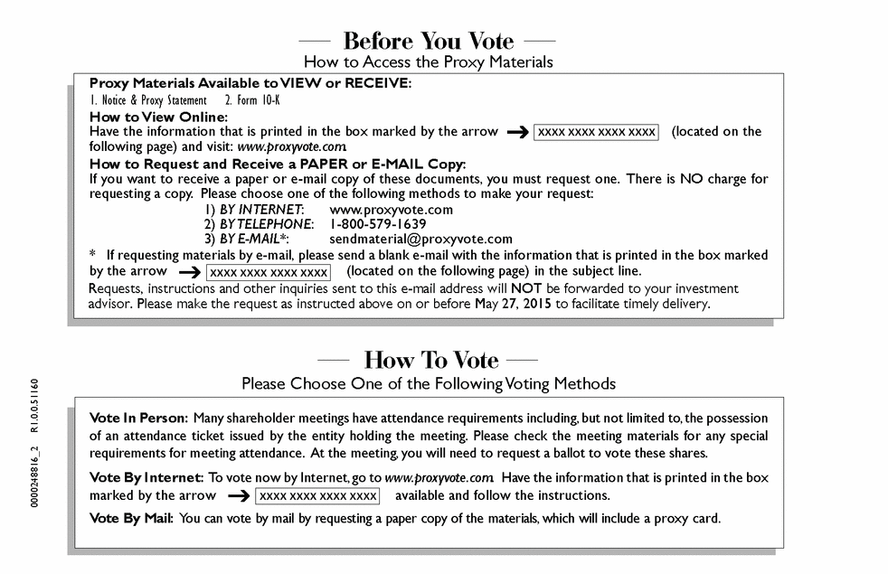 Please Choose One of the Following Voting Methods Vote In Person: Many shareholder meetings have attendance requirements including, but not limited to, the possession of an attendance ticket issued by the entity holding the meeting. Please check the meeting materials for any special requirements for meeting attendance. At the meeting, you will need to request a ballot to vote these shares. Vote By Internet: To vote now by Internet, go to www.proxyvote.com. Have the information that is printed in the box marked by the arrow available and follow the instructions. Vote By Mail: You can vote by mail by requesting a paper copy of the materials, which will include a proxy card. How To Vote . Before You Vote How to Access the Proxy Materials Proxy Materials Available to VIEW or RECEIVE: How to View Online: Have the information that is printed in the box marked by the arrow (located on the following page) and visit: www.proxyvote.com. How to Request and Receive a PAPER or E-MAIL Copy: If you want to receive a paper or e-mail copy of these documents, you must request one. There is NO charge for requesting a copy. Please choose one of the following methods to make your request: 1) BY INTERNET: www.proxyvote.com 2) BY TELEPHONE: 1-800-579-1639 3) BY E-MAIL*: sendmaterial@proxyvote.com * If requesting materials by e-mail, please send a blank e-mail with the information that is printed in the box marked by the arrow (located on the following page) in the subject line. . . 0000248816_2 R1.0.0.51160 1. Notice & Proxy Statement 2. Form 10-K Requests, instructions and other inquiries sent to this e-mail address will NOT be forwarded to your investment advisor. Please make the request as instructed above on or before May 27, 2015 to facilitate timely delivery. |