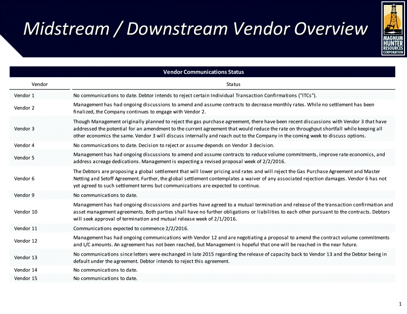 Midstream / Downstream Vendor Overview Vendor Status Management has had ongoing discussions to a mend and assume contracts to decrease monthly rates. While no settlement has been finalize, the Company continues to engage with Vendor 2. Vendor 2 Vendor 4 No communications to date. Decision to reject or assume depends on Vendor 3 decision. address acreage dedications. Management is expecting a revised proposal week of 2/2/2016. The Debtors are proposing a global settlement that will lower pricing and rates and will reject the Gas Purchase Agreement and Master Netting and Setoff Agreement. Further, the global settlement contemplates a waiver of any associated rejection damages. Vendor 6 has not yet agreed to such settlement terms but communications are expected to continue. Vendor 6 Management has had ongoing discussions and parties have agreed to a mutual termination and release of the transaction confirmation and asset management agreements. Both parties shall have no further obligations or liabilities to each other pursuant to the contracts. Debtors will seek approval of termination and mutual release week of 2/1/2016. Vendor 10 Management has had ongoing communications with Vendor 12 and are negotiating a proposal to amend the contract volume commitments and L/C amounts. An agreement has not been reached, but Management is hopeful that one will be reached in the near future. Vendor 12 default under the agreement. Debtor intends to reject this agreement. Vendor 14 No communications to date. 1 CONFIDENTIAL; SUBJECT TO COMMON INTEREST PRIVILEGE Vendor 15 No communications to date. Vendor 13 No communications since letters were exchanged in late 2015 regarding the release of capacity back to Vendor 13 and the Debtor being in Vendor 11Communications expected to commence 2/2/2016. Vendor 9 No communications to date. Vendor 5 Management has had ongoing discussions to a mend and assume contracts to reduce volume commitments, improve rate economics , and Though Management originally planned to reject the gas purchase agreement, there have been recent discussions with Vendor 3 that have Vendor 3 addressed the potential for an amendment to the current agreement that would reduce the ra te on throughput shortfall while keeping all other economics the same. Vendor 3 will discuss internally and reach out to the Company in the coming week to discuss options. Vendor 1 No communications to date. Debtor intends to reject certain Individual Transaction Confirmations ("ITCs"). Vendor Communications Status