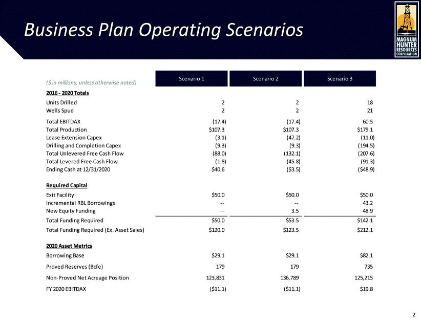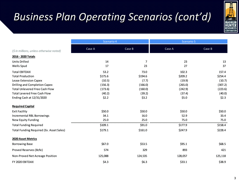 Business Plan Operating Scenarios ($ in millions, unless otherwise noted) 2016 - 2020 Totals Units Drilled Wells Spud Total EBITDAX Total Production Lease Extension Capex Drilling and Completion Capex Total Unlevered Free Cash Flow Total Levered Free Cash Flow Ending Cash at 12/31/2020 2 2 (17.4) $107.3 (3.1) (9.3) (88.0) (1.8) $40.6 2 2 (17.4) $107.3 (47.2) (9.3) (132.1) (45.8) ($3.5) 18 21 60.5 $179.1 (11.0) (194.5) (207.6) (91.3) ($48.9) Required Capital Exit Facility Incremental RBL Borrowings New Equity Funding Total Funding Required Total Funding Required (Ex. Asset Sales) $50.0 $50.0 3.5 $50.0 -- -- 43.2 -- 48.9 $50.0 $120.0 $53.5 $123.5 $142.1 $212.1 2020 Asset Metrics Borrowing Base Proved Reserves (Bcfe) Non-Proved Net Acreage Position FY 2020 EBITDAX $29.1 179 123,831 ($11.1) $29.1 179 136,789 ($11.1) $82.1 735 125,215 $19.8 2 CONFIDENTIAL; SUBJECT TO COMMON INTEREST PRIVILEGE Scenario 3 Scenario 2 Scenario 1
