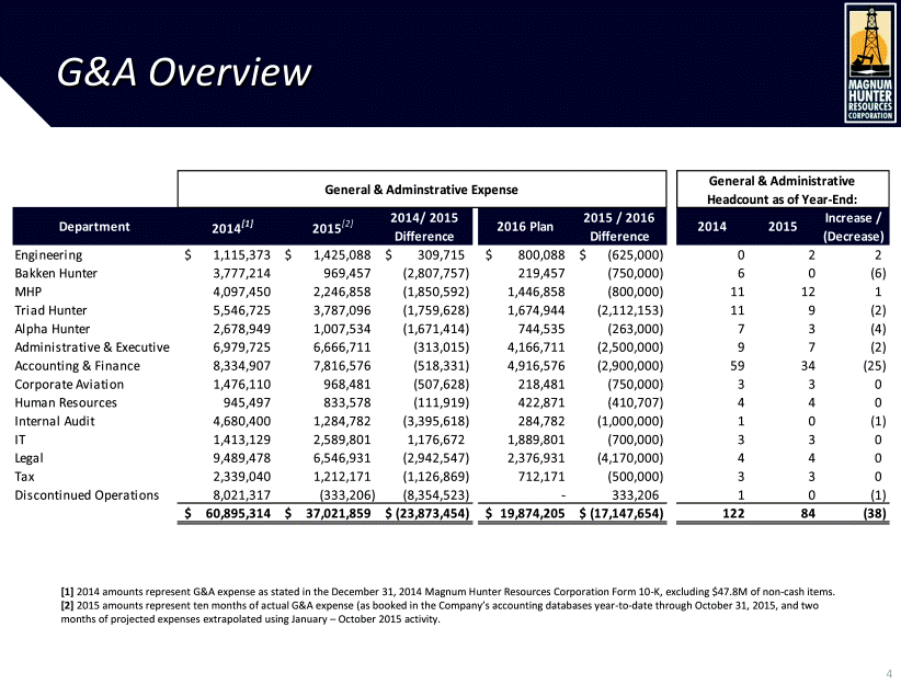 G&A Overview Headcount as of Year-End: (Decrease) Engineering Bakken Hunter MHP Triad Hunter Alpha Hunter Administrative & Executive Accounting & Finance Corporate Aviation Human Resources Internal Audit IT Legal Tax Discontinued Operations $ 1,115,373 3,777,214 4,097,450 5,546,725 2,678,949 6,979,725 8,334,907 1,476,110 945,497 4,680,400 1,413,129 9,489,478 2,339,040 $ 1,425,088 969,457 2,246,858 3,787,096 1,007,534 6,666,711 7,816,576 968,481 833,578 1,284,782 2,589,801 6,546,931 1,212,171 $ 309,715 (2,807,757) (1,850,592) (1,759,628) (1,671,414) (313,015) (518,331) (507,628) (111,919) (3,395,618) 1,176,672 (2,942,547) (1,126,869) $ 800,088 219,457 1,446,858 1,674,944 744,535 4,166,711 4,916,576 218,481 422,871 284,782 1,889,801 2,376,931 712,171 $ (625,000) (750,000) (800,000) (2,112,153) (263,000) (2,500,000) (2,900,000) (750,000) (410,707) (1,000,000) (700,000) (4,170,000) (500,000) 0 6 11 11 7 9 59 3 4 1 3 4 3 2 0 12 9 3 7 34 3 4 0 3 4 3 2 (6) 1 (2) (4) (2) (25) 0 0 (1) 0 0 0 8,021,317 (333,206) (8,354,523) - 333,206 1 0 (1) $ 60,895,314 $ 37,021,859 $ (23,873,454) $ 19,874,205 $ (17,147,654) 122 84 (38) [1] 2014 amounts represent G&A expense as stated in the December 31, 2014 Magnum Hunter Resources Corporation Form 10-K, excluding $47.8M of non-cash items. [2] 2015 amounts represent ten months of actual G&A expense (as booked in the Company’s accounting databases year-to-date through October 31, 2015, and two months of projected expenses extrapolated using January – October 2015 activity. 4 CONFIDENTIAL; SUBJECT TO COMMON INTEREST PRIVILEGE General & Administrative 2014 2015 Increase / General & Adminstrative Expense Department2014[1] 2015[2] 2014/ 2015 Difference 2016 Plan 2015 / 2016 Difference