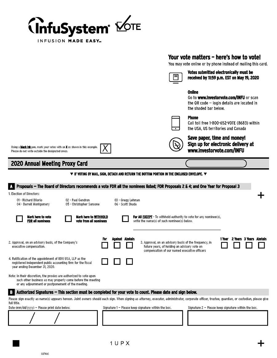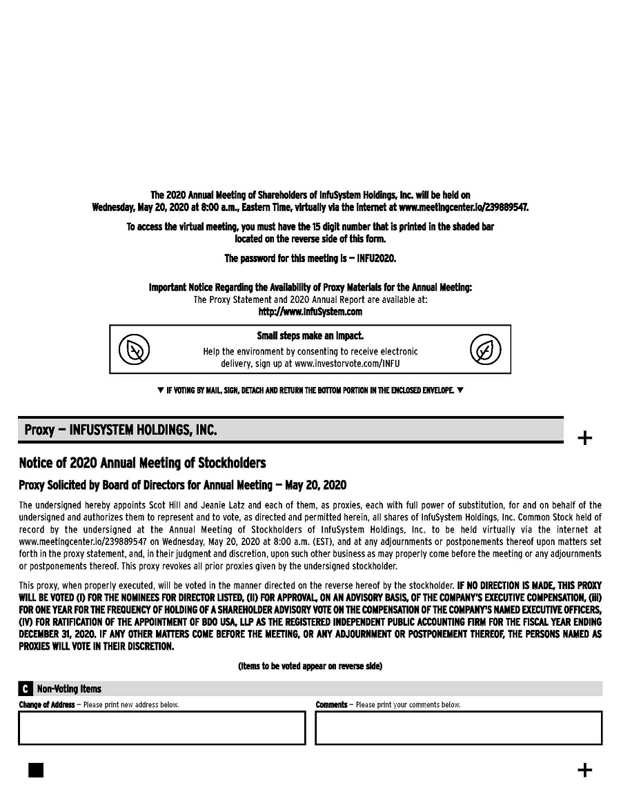 This proxy statement is being furnished in connection with the solicitation of proxies by and on behalf of the Board of Directors (the “Board” or “Board of Directors”) of InfuSystem Holdings, Inc. (the “Company”) to be used at the Annual Meeting of Stockholders to be held on Wednesday, May 20, 2020, commencing at 8:00 a.m. Eastern Time, and at any postponement or adjournment thereof (the “Annual Meeting”), for the purposes set forth in the accompanying Notice of Meeting. We are holding our annual meeting solely by means of remote communication. You can attend the Annual Meeting online, vote your shares, and submit questions during the meeting by visiting www.meetingcenter.io/239889547. This proxy statement and the accompanying materials are being first sent or given to stockholders of the Company on or about April 3, 2020.