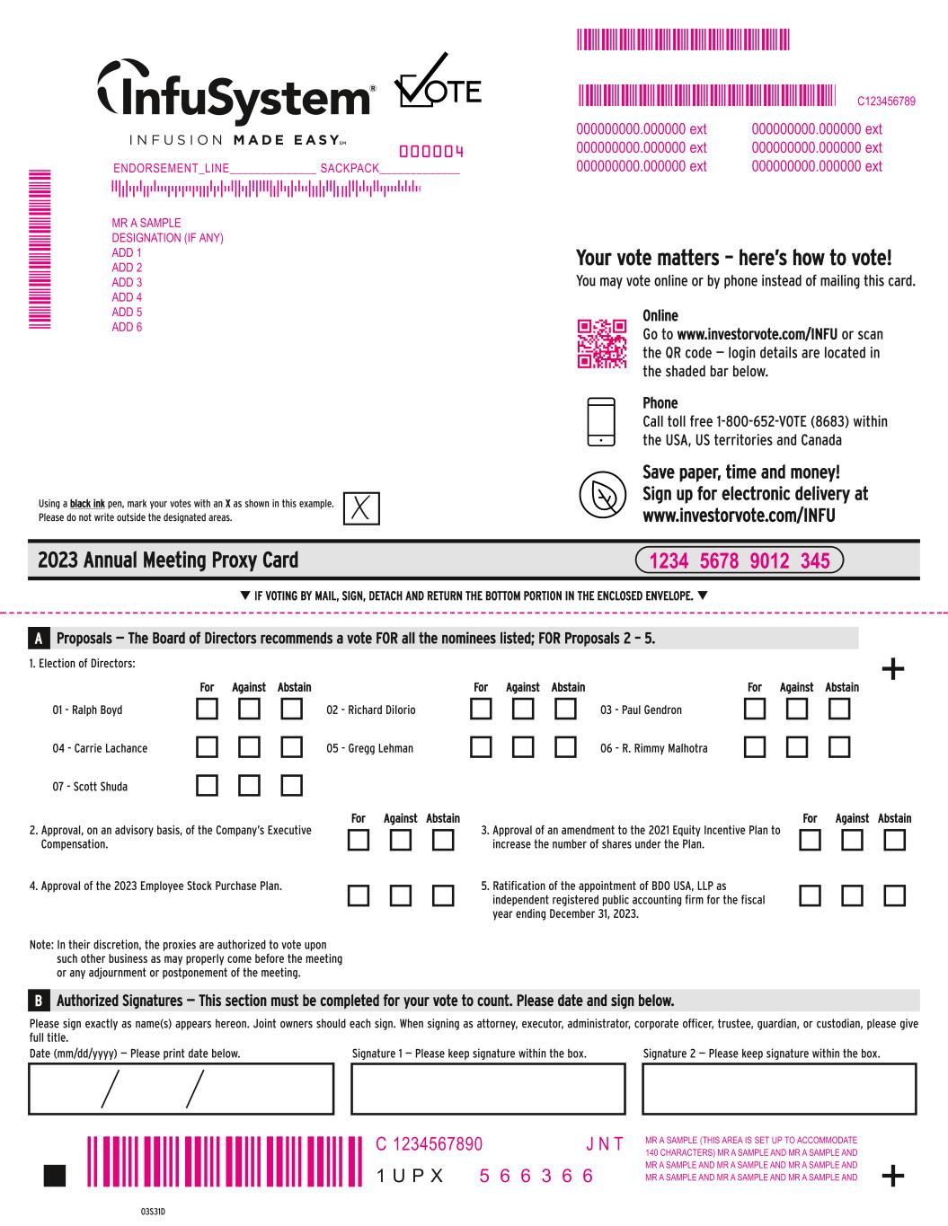 Proposals — The Board of Directors recommend a vote FOR all the nominees listed, FOR Proposals X – X and for every X YEARS on Proposal X. 01 - Ralph Boyd 04 - Carrie Lachance 07 - Scott Shuda 02 - Richard DiIorio 05 - Gregg Lehman 03 - Paul Gendron 06 - R. Rimmy Malhotra For Against Abstain For Against Abstain For Against Abstain 1 U P X Using a black ink pen, mark your votes with an X as shown in this example. Please do not write outside the designated areas. 03S31D + + 2. Approval, on an advisory basis, of the Company’s Executive Compensation. 1. Election of Directors: For Against Abstain Please sign exactly as name(s) appears hereon. Joint owners should each sign. When signing as attorney, executor, administrator, corporate officer, trustee, guardian, or custodian, please give full title. Signature 1 — Please keep signature within the box. Signature 2 — Please keep signature within the box.Date (mm/dd/yyyy) — Please print date below. Authorized Signatures — This section must be completed for your vote to count. Please date and sign below.B q IF VOTING BY MAIL, SIGN, DETACH AND RETURN THE BOTTOM PORTION IN THE ENCLOSED ENVELOPE. q 2023 Annual Meeting Proxy Card i t r r c ends a vote FOR all the nominees listed; FOR Pr posals 2 – 5.A Note: In their discretion, the proxies are authorized to vote upon such other business as may properly come before the meeting or any adjournment or postponement of the meeting. 3. Approval of an amendment to the 2021 Equity Incentive Plan to increase the number of shares under the Plan. For Against Abstain 4. Approval of the 2023 Employee Stock Purchase Plan. 5. Ratification of the appointment of BDO USA, LLP as independent registered public accounting firm for the fiscal year ending December 31, 2023. 000004 MR A SAMPLE DESIGNATION (IF ANY) ADD 1 ADD 2 ADD 3 ADD 4 ADD 5 ADD 6 ENDORSEMENT_LINE______________ SACKPACK_____________ 1234 5678 9012 345 M M M M M M M M M MMMMMMMMMMMMMMM 5 6 6 3 6 6 MR A SAMPLE (THIS AREA IS SET UP TO ACCOMMODATE 140 CHARACTERS) MR A SAMPLE AND MR A SAMPLE AND MR A SAMPLE AND MR A SAMPLE AND MR A SAMPLE AND MR A SAMPLE AND MR A SAMPLE AND MR A SAMPLE AND C 1234567890 J N T C123456789 MMMMMMMMMMMM MMMMMMM 000000000.000000 ext 000000000.000000 ext 000000000.000000 ext 000000000.000000 ext 000000000.000000 ext 000000000.000000 ext If no electronic voting, delete QR code and control # Δ ≈ You may vote online or by phone instead of mailing this card. Online Go to www.investorvote.com/INFU or scan the QR code — login details are located in the shaded bar below. Save paper, time and money! Sign up for electronic delivery at www.investorvote.com/INFU Phone Call toll free 1-800-652-VOTE (8683) within the USA, US territories and Canada Your vote matters – here’s how to vote!