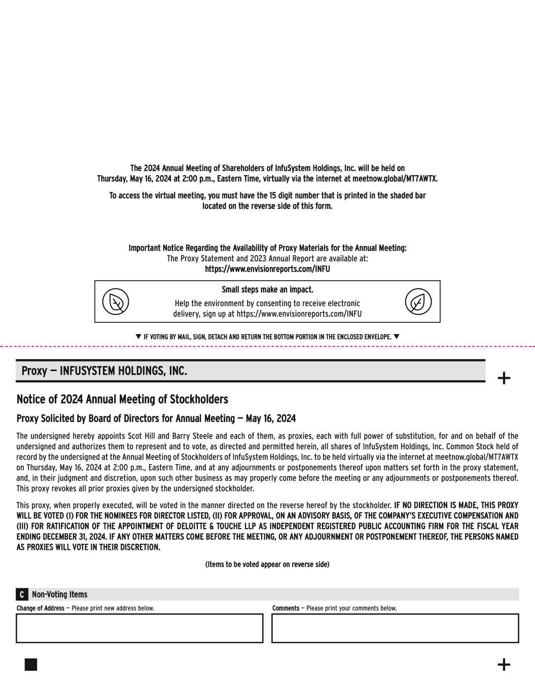 Small steps make an impact. Help the environment by consenting to receive electronic delivery, sign up at https://www.envisionreports.com/INFU Notice of 2024 Annual Meeting of Stockholders Proxy Solicited by Board of Directors for Annual Meeting — May 16, 2024 The undersigned hereby appoints Scot Hill and Barry Steele and each of them, as proxies, each with full power of substitution, for and on behalf of the undersigned and authorizes them to represent and to vote, as directed and permitted herein, all shares of InfuSystem Holdings, Inc. Common Stock held of record by the undersigned at the Annual Meeting of Stockholders of InfuSystem Holdings, Inc. to be held virtually via the internet at meetnow.global/MT7AWTX on Thursday, May 16, 2024 at 2:00 p.m., Eastern Time, and at any adjournments or postponements thereof upon matters set forth in the proxy statement, and, in their judgment and discretion, upon such other business as may properly come before the meeting or any adjournments or postponements thereof. This proxy revokes all prior proxies given by the undersigned stockholder. This proxy, when properly executed, will be voted in the manner directed on the reverse hereof by the stockholder. IF NO DIRECTION IS MADE, THIS PROXY WILL BE VOTED (I) FOR THE NOMINEES FOR DIRECTOR LISTED, (II) FOR APPROVAL, ON AN ADVISORY BASIS, OF THE COMPANY’S EXECUTIVE COMPENSATION AND (III) FOR RATIFICATION OF THE APPOINTMENT OF DELOITTE & TOUCHE LLP AS INDEPENDENT REGISTERED PUBLIC ACCOUNTING FIRM FOR THE FISCAL YEAR ENDING DECEMBER 31, 2024. IF ANY OTHER MATTERS COME BEFORE THE MEETING, OR ANY ADJOURNMENT OR POSTPONEMENT THEREOF, THE PERSONS NAMED AS PROXIES WILL VOTE IN THEIR DISCRETION. (Items to be voted appear on reverse side) Proxy — INFUSYSTEM HOLDINGS, INC. q IF VOTING BY MAIL, SIGN, DETACH AND RETURN THE BOTTOM PORTION IN THE ENCLOSED ENVELOPE.q Change of Address — Please print new address below. Comments — Please print your comments below. Non-Voting ItemsC + + Important Notice Regarding the Availability of Proxy Materials for the Annual Meeting: The Proxy Statement and 2023 Annual Report are available at: https://www.envisionreports.com/INFU The 2024 Annual Meeting of Shareholders of InfuSystem Holdings, Inc. will be held on Thursday, May 16, 2024 at 2:00 p.m., Eastern Time, virtually via the internet at meetnow.global/MT7AWTX. To access the virtual meeting, you must have the 15 digit number that is printed in the shaded bar located on the reverse side of this form.