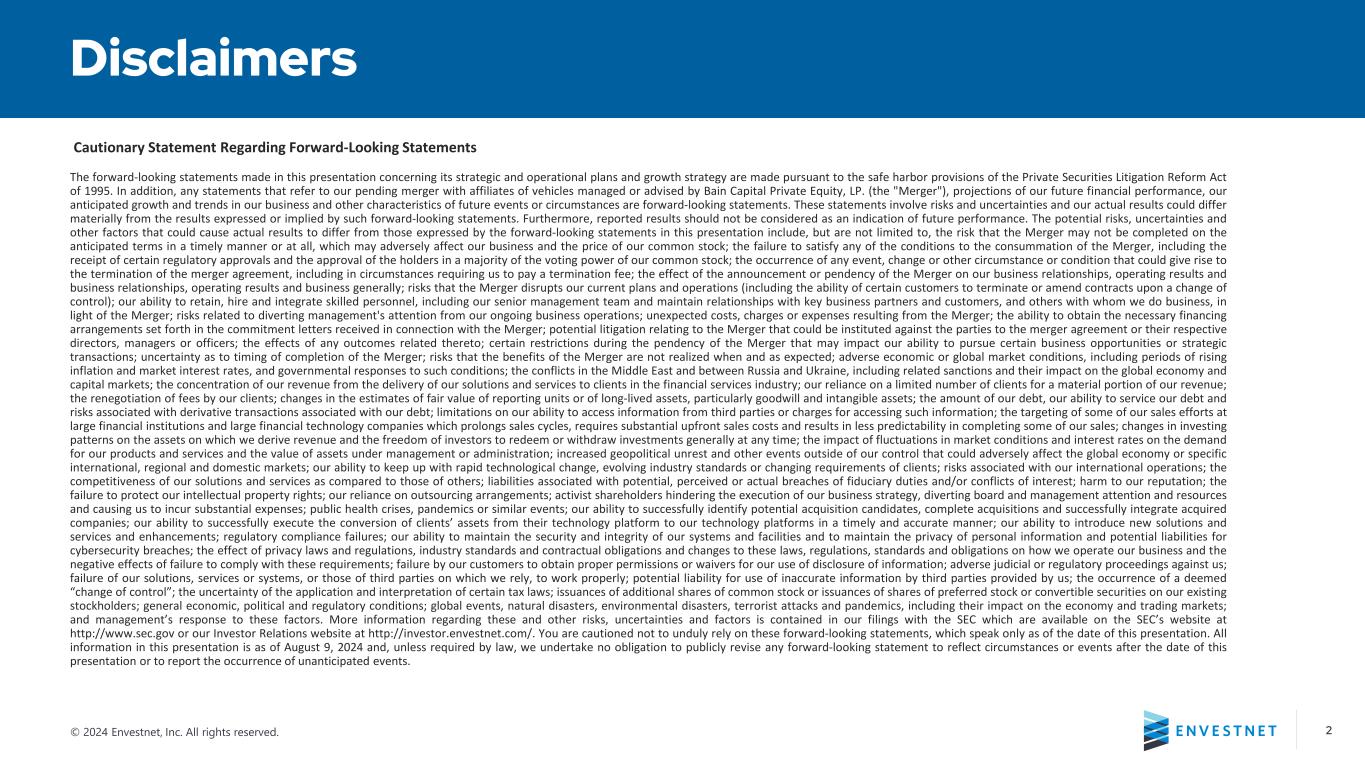 2 Disclaimers Cautionary Statement Regarding Forward-Looking Statements The forward-looking statements made in this presentation concerning its strategic and operational plans and growth strategy are made pursuant to the safe harbor provisions of the Private Securities Litigation Reform Act of 1995. In addition, any statements that refer to our pending merger with affiliates of vehicles managed or advised by Bain Capital Private Equity, LP. (the "Merger"), projections of our future financial performance, our anticipated growth and trends in our business and other characteristics of future events or circumstances are forward-looking statements. These statements involve risks and uncertainties and our actual results could differ materially from the results expressed or implied by such forward-looking statements. Furthermore, reported results should not be considered as an indication of future performance. The potential risks, uncertainties and other factors that could cause actual results to differ from those expressed by the forward-looking statements in this presentation include, but are not limited to, the risk that the Merger may not be completed on the anticipated terms in a timely manner or at all, which may adversely affect our business and the price of our common stock; the failure to satisfy any of the conditions to the consummation of the Merger, including the receipt of certain regulatory approvals and the approval of the holders in a majority of the voting power of our common stock; the occurrence of any event, change or other circumstance or condition that could give rise to the termination of the merger agreement, including in circumstances requiring us to pay a termination fee; the effect of the announcement or pendency of the Merger on our business relationships, operating results and business relationships, operating results and business generally; risks that the Merger disrupts our current plans and operations (including the ability of certain customers to terminate or amend contracts upon a change of control); our ability to retain, hire and integrate skilled personnel, including our senior management team and maintain relationships with key business partners and customers, and others with whom we do business, in light of the Merger; risks related to diverting management's attention from our ongoing business operations; unexpected costs, charges or expenses resulting from the Merger; the ability to obtain the necessary financing arrangements set forth in the commitment letters received in connection with the Merger; potential litigation relating to the Merger that could be instituted against the parties to the merger agreement or their respective directors, managers or officers; the effects of any outcomes related thereto; certain restrictions during the pendency of the Merger that may impact our ability to pursue certain business opportunities or strategic transactions; uncertainty as to timing of completion of the Merger; risks that the benefits of the Merger are not realized when and as expected; adverse economic or global market conditions, including periods of rising inflation and market interest rates, and governmental responses to such conditions; the conflicts in the Middle East and between Russia and Ukraine, including related sanctions and their impact on the global economy and capital markets; the concentration of our revenue from the delivery of our solutions and services to clients in the financial services industry; our reliance on a limited number of clients for a material portion of our revenue; the renegotiation of fees by our clients; changes in the estimates of fair value of reporting units or of long-lived assets, particularly goodwill and intangible assets; the amount of our debt, our ability to service our debt and risks associated with derivative transactions associated with our debt; limitations on our ability to access information from third parties or charges for accessing such information; the targeting of some of our sales efforts at large financial institutions and large financial technology companies which prolongs sales cycles, requires substantial upfront sales costs and results in less predictability in completing some of our sales; changes in investing patterns on the assets on which we derive revenue and the freedom of investors to redeem or withdraw investments generally at any time; the impact of fluctuations in market conditions and interest rates on the demand for our products and services and the value of assets under management or administration; increased geopolitical unrest and other events outside of our control that could adversely affect the global economy or specific international, regional and domestic markets; our ability to keep up with rapid technological change, evolving industry standards or changing requirements of clients; risks associated with our international operations; the competitiveness of our solutions and services as compared to those of others; liabilities associated with potential, perceived or actual breaches of fiduciary duties and/or conflicts of interest; harm to our reputation; the failure to protect our intellectual property rights; our reliance on outsourcing arrangements; activist shareholders hindering the execution of our business strategy, diverting board and management attention and resources and causing us to incur substantial expenses; public health crises, pandemics or similar events; our ability to successfully identify potential acquisition candidates, complete acquisitions and successfully integrate acquired companies; our ability to successfully execute the conversion of clients’ assets from their technology platform to our technology platforms in a timely and accurate manner; our ability to introduce new solutions and services and enhancements; regulatory compliance failures; our ability to maintain the security and integrity of our systems and facilities and to maintain the privacy o