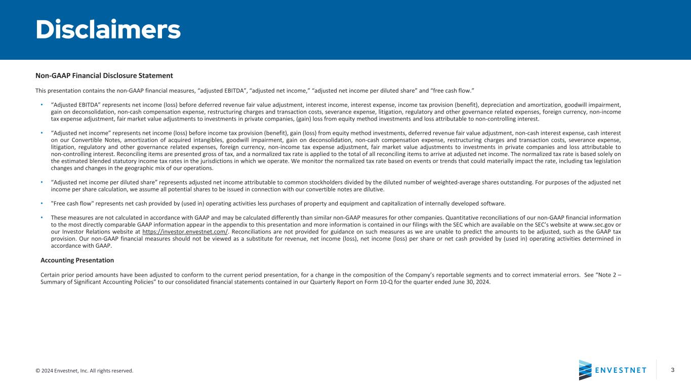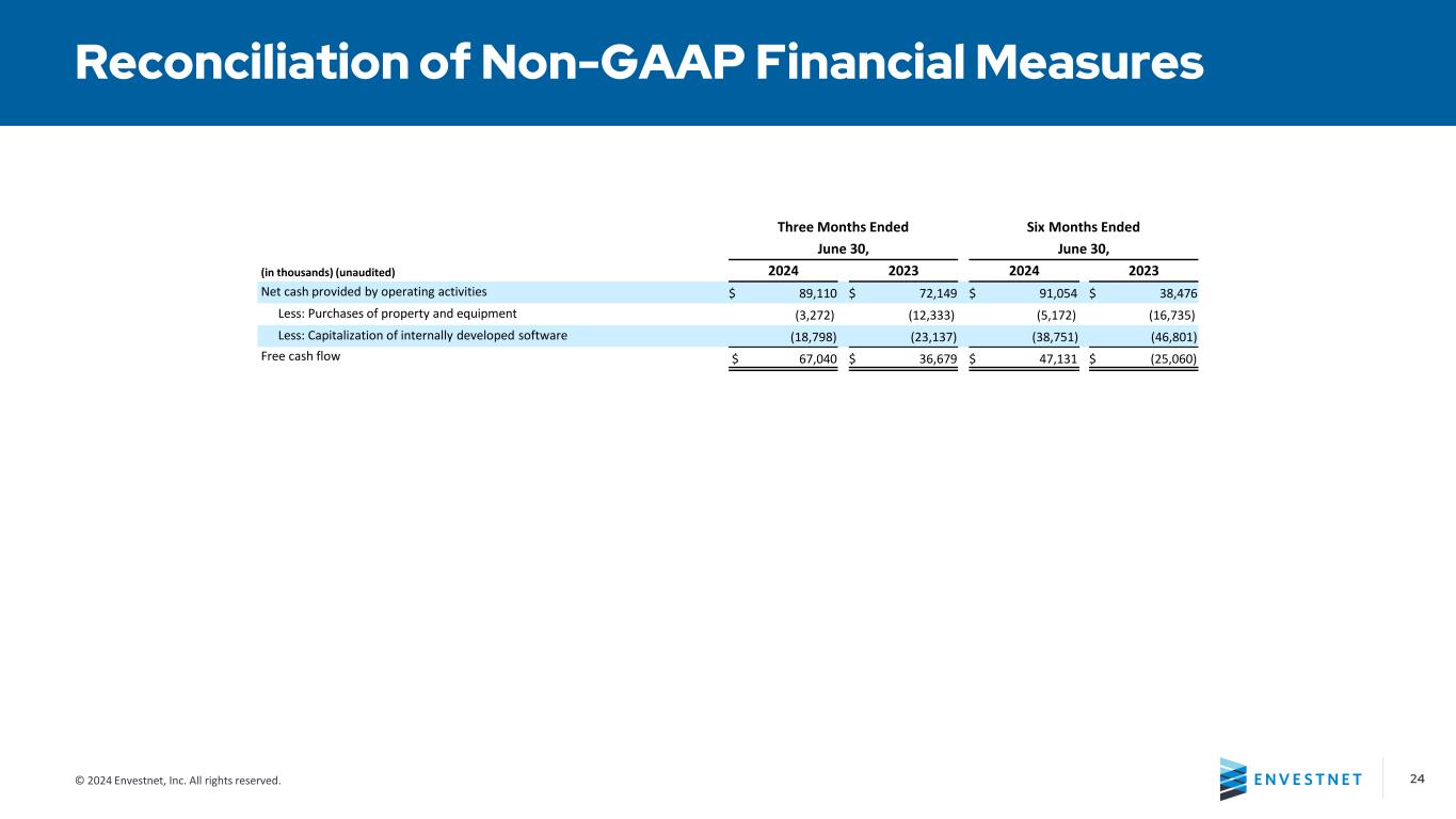 23 Reconciliation of Non-GAAP Financial Measures Three Months Ended Six Months Ended June 30, June 30, (In thousands, except share and per share information) (unaudited) 2024 2023 2024 2023 Net loss $ (79,201) $ (23,132) $ (78,662) $ (65,893) Income tax provision (benefit) (652) 418 853 24,187 Gain (loss) from equity method investments 482 (2,386) (1,801) (5,326) Loss before income tax provision and equity method investments (80,335) (20,328) (76,008) (36,380) Add (deduct): Deferred revenue fair value adjustment — 17 — 69 Non-cash interest expense 1,412 1,427 2,817 2,869 Cash interest – Convertible Notes 4,369 4,543 8,738 9,108 Amortization of acquired intangibles 14,457 15,720 29,199 32,660 Goodwill impairment 96,269 — 96,269 — Gain on deconsolidation (19,523) — (19,523) — Non-cash compensation expense 17,822 21,390 36,720 40,843 Restructuring charges and transaction costs 8,405 6,508 10,461 10,671 Severance expense 669 8,234 4,094 14,422 Litigation, regulatory and other governance related expenses 4,020 2,145 6,308 5,219 Foreign currency (229) 74 46 107 Non-income tax expense adjustment (39) (30) (88) (198) Fair market value adjustments to investments in private companies 1,508 67 1,508 67 Loss attributable to non-controlling interest — 1,027 1,160 1,805 Adjusted net income before income tax effect 48,805 40,794 101,701 81,262 Income tax effect (12,445) (10,403) (25,934) (20,722) Adjusted net income $ 36,360 $ 30,391 $ 75,767 $ 60,540 Basic number of weighted-average shares outstanding 55,143,013 54,439,733 55,013,544 54,289,443 Effect of dilutive shares: Convertible Notes 10,811,884 11,253,471 10,811,884 11,361,458 Non-vested RSUs and PSUs 590,918 316,758 527,360 445,323 Options to purchase common stock 49,692 57,902 38,996 73,271 Diluted number of weighted-average shares outstanding 66,595,507 66,067,864 66,391,784 66,169,495 Adjusted net income per diluted share $ 0.55 $ 0.46 $ 1.14 $ 0.91 © 2024 Envestnet, Inc. All rights reserved.