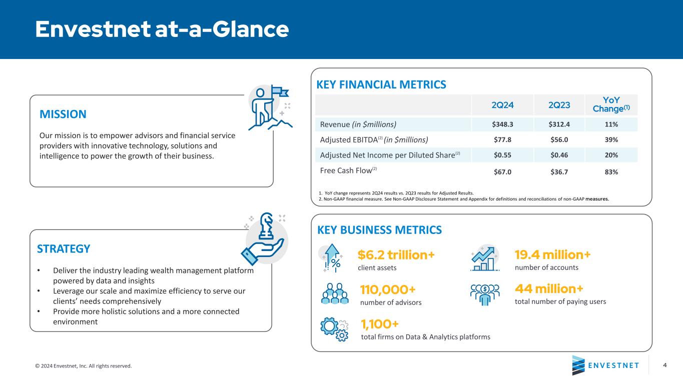 3 Disclaimers Non-GAAP Financial Disclosure Statement This presentation contains the non-GAAP financial measures, “adjusted EBITDA”, “adjusted net income,” “adjusted net income per diluted share” and “free cash flow.” • “Adjusted EBITDA” represents net income (loss) before deferred revenue fair value adjustment, interest income, interest expense, income tax provision (benefit), depreciation and amortization, goodwill impairment, gain on deconsolidation, non-cash compensation expense, restructuring charges and transaction costs, severance expense, litigation, regulatory and other governance related expenses, foreign currency, non-income tax expense adjustment, fair market value adjustments to investments in private companies, (gain) loss from equity method investments and loss attributable to non-controlling interest. • “Adjusted net income” represents net income (loss) before income tax provision (benefit), gain (loss) from equity method investments, deferred revenue fair value adjustment, non-cash interest expense, cash interest on our Convertible Notes, amortization of acquired intangibles, goodwill impairment, gain on deconsolidation, non-cash compensation expense, restructuring charges and transaction costs, severance expense, litigation, regulatory and other governance related expenses, foreign currency, non-income tax expense adjustment, fair market value adjustments to investments in private companies and loss attributable to non-controlling interest. Reconciling items are presented gross of tax, and a normalized tax rate is applied to the total of all reconciling items to arrive at adjusted net income. The normalized tax rate is based solely on the estimated blended statutory income tax rates in the jurisdictions in which we operate. We monitor the normalized tax rate based on events or trends that could materially impact the rate, including tax legislation changes and changes in the geographic mix of our operations. • “Adjusted net income per diluted share” represents adjusted net income attributable to common stockholders divided by the diluted number of weighted-average shares outstanding. For purposes of the adjusted net income per share calculation, we assume all potential shares to be issued in connection with our convertible notes are dilutive. • "Free cash flow" represents net cash provided by (used in) operating activities less purchases of property and equipment and capitalization of internally developed software. • These measures are not calculated in accordance with GAAP and may be calculated differently than similar non-GAAP measures for other companies. Quantitative reconciliations of our non-GAAP financial information to the most directly comparable GAAP information appear in the appendix to this presentation and more information is contained in our filings with the SEC which are available on the SEC’s website at www.sec.gov or our Investor Relations website at https://investor.envestnet.com/. Reconciliations are not provided for guidance on such measures as we are unable to predict the amounts to be adjusted, such as the GAAP tax provision. Our non-GAAP financial measures should not be viewed as a substitute for revenue, net income (loss), net income (loss) per share or net cash provided by (used in) operating activities determined in accordance with GAAP. Accounting Presentation Certain prior period amounts have been adjusted to conform to the current period presentation, for a change in the composition of the Company’s reportable segments and to correct immaterial errors. See “Note 2 – Summary of Significant Accounting Policies” to our consolidated financial statements contained in our Quarterly Report on Form 10-Q for the quarter ended June 30, 2024. © 2024 Envestnet, Inc. All rights reserved.