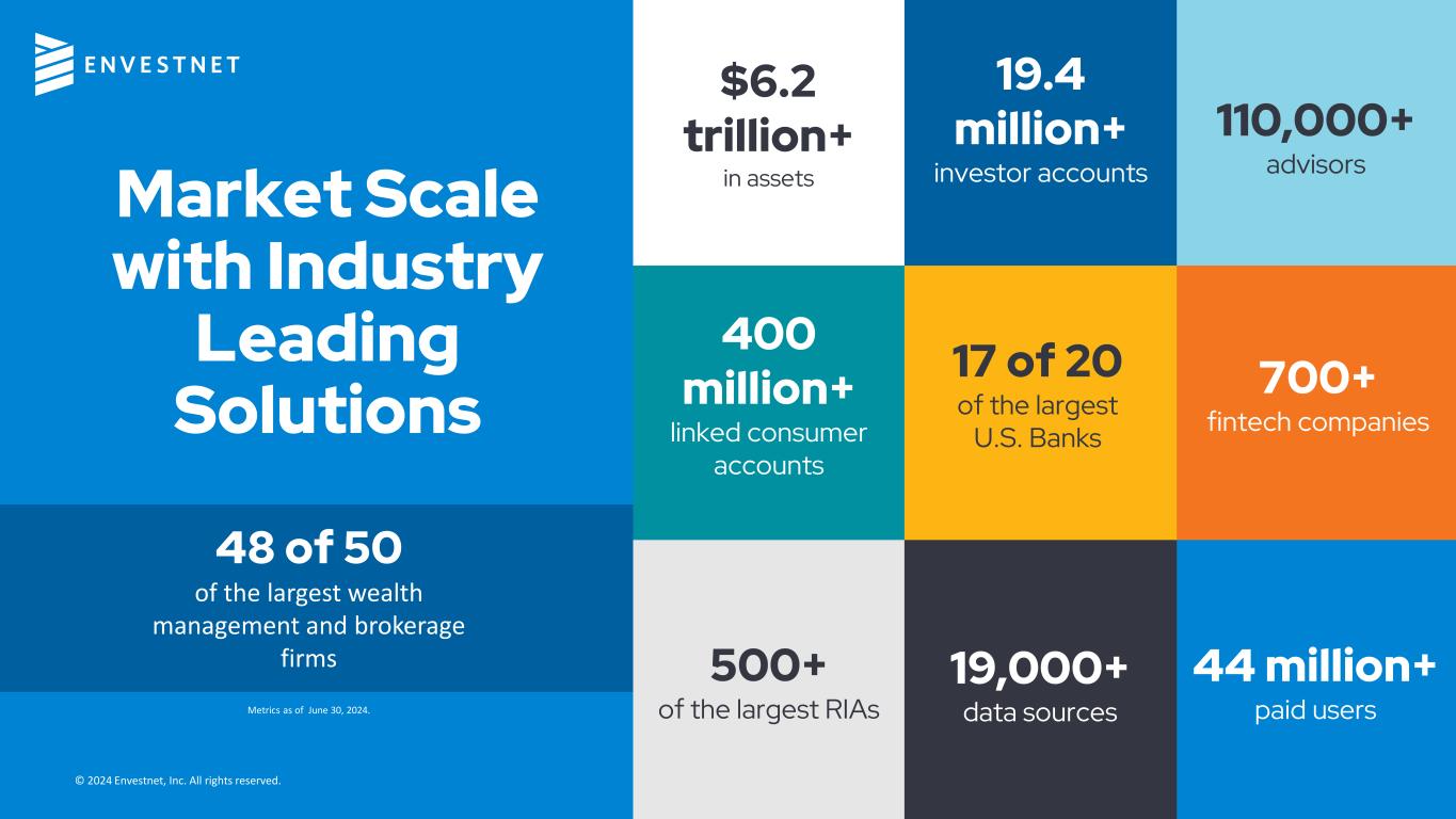 5© 2024 Envestnet, Inc. All rights reserved. Market Scale with Industry Leading Solutions 44 million+ paid users 110,000+ advisors 17 of 20 of the largest U.S. Banks 400 million+ linked consumer accounts 500+ of the largest RIAs 700+ fintech companies 48 of 50 of the largest wealth management and brokerage firms 19.4 million+ investor accounts 19,000+ data sources $6.2 trillion+ in assets Metrics as of June 30, 2024. © 2024 Envestnet, Inc. All rights reserved.