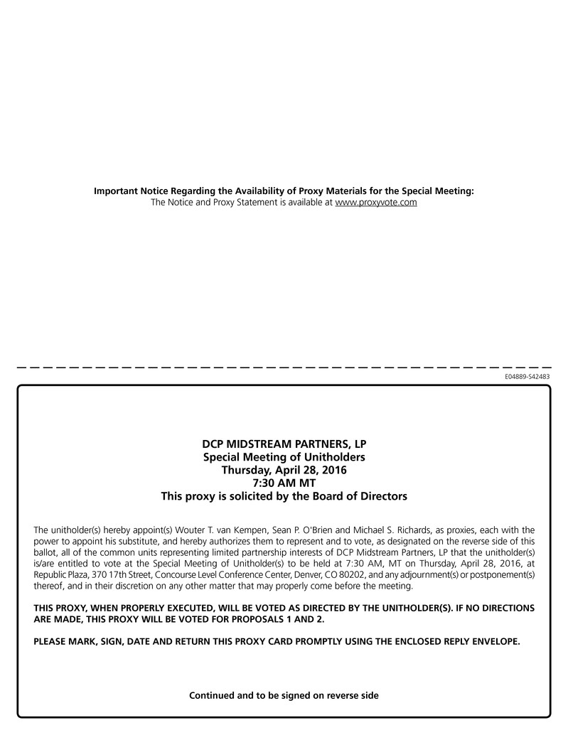 On behalf of the Board of Directors of DCP Midstream GP, LLC (the “Board of Directors”), the general partner of DCP Midstream GP, LP, the general partner of DCP Midstream Partners, LP (the “Partnership”), you are cordially invited to attend a special meeting of the unitholders of the Partnership (the “Special Meeting”), which will be held on April 28, 2016 at 7:30 a.m. local time at Republic Plaza, Concourse Level Conference Center, 370 17th Street, Denver, Colorado 80202. At the Special Meeting, you will be asked to consider and vote on the following proposals: