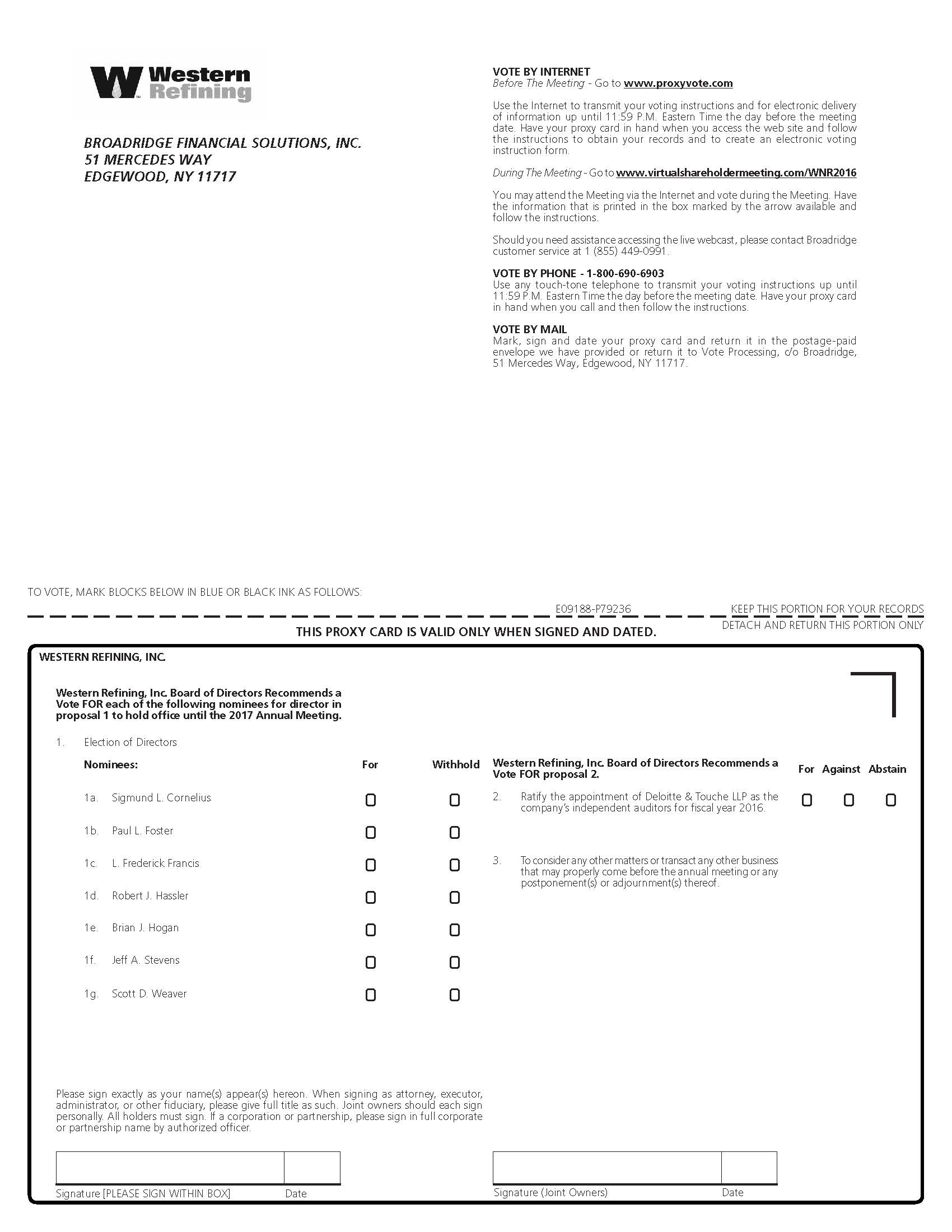The Board of Directors (the "Board") of Western Refining, Inc. (the "Company" or "WNR") is soliciting proxies to be voted at the 2016 Annual Meeting of Shareholders (the "Annual Meeting" or the "2016 Annual Meeting") of the Company which will be held virtually via live webcast at www.virtualshareholdermeeting.com/WNR2016 on June 17, 2016, at 8:30 a.m. MDT and at any adjournment(s) or postponement(s) of the Annual Meeting. The Company is mailing the Notice of Internet Availability of Proxy Materials (the "Notice") to all shareholders of record at the close of business on April 18, 2016, on or about April 22, 2016. You are invited to participate in the Annual Meeting and vote your shares in accordance with the instructions at www.virtualshareholdermeeting.com/WNR2016. On April 22, 2016, you will have the ability to access all of the Company's proxy materials and its 2015 Annual Report online at www.proxyvote.com. At the Annual Meeting, shareholders will be requested to: