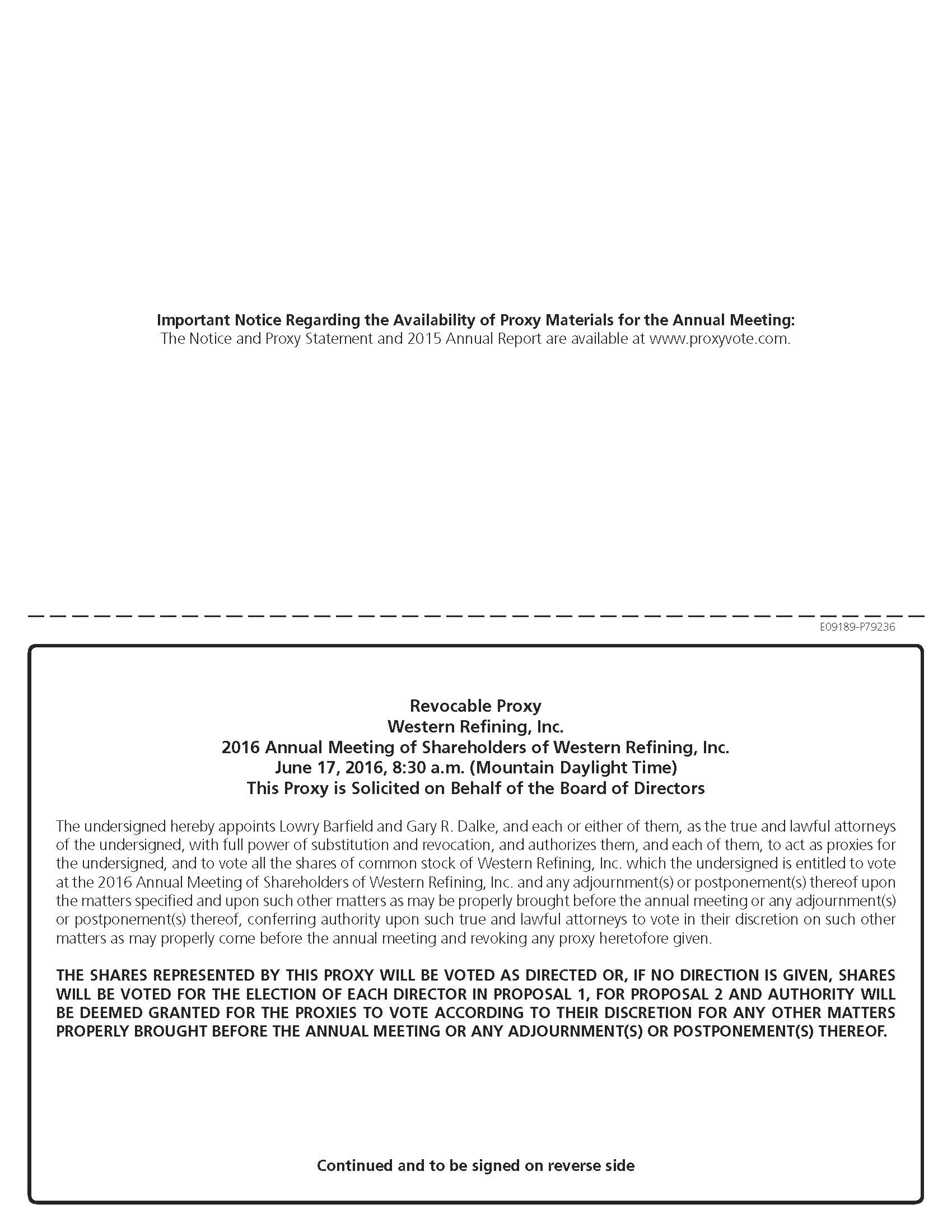 On behalf of the Board of Directors, I cordially invite all shareholders to participate in the 2016 Annual Meeting of Shareholders (the "Annual Meeting") of Western Refining, Inc. (the "Company") which will be held virtually via live webcast at www.virtualshareholdermeeting.com/WNR2016 on June 17, 2016, at 8:30 a.m. MDT. During the Annual Meeting, you will be able to participate in the Annual Meeting online as well as vote your shares and submit questions. Details regarding how to participate in the Annual Meeting and the business to be conducted at the Annual Meeting are provided in the Company's Proxy Statement.