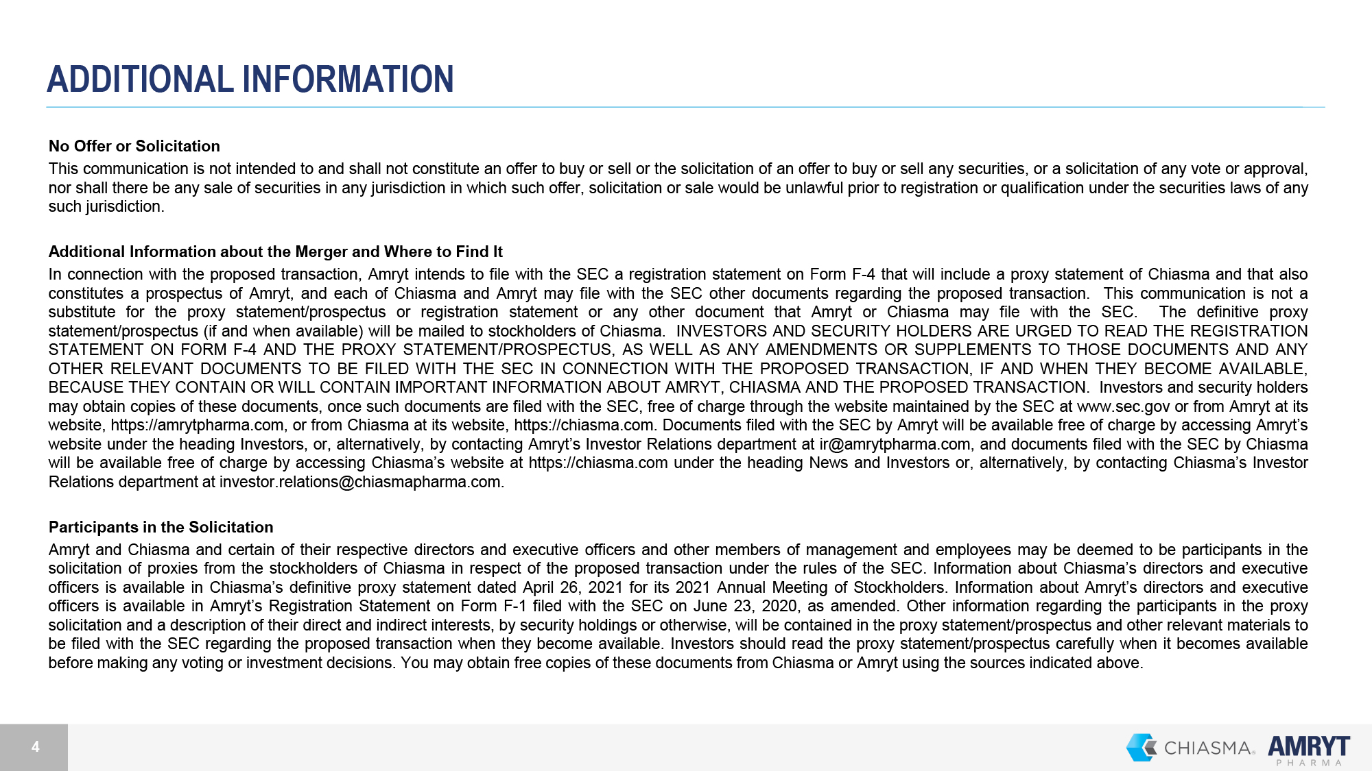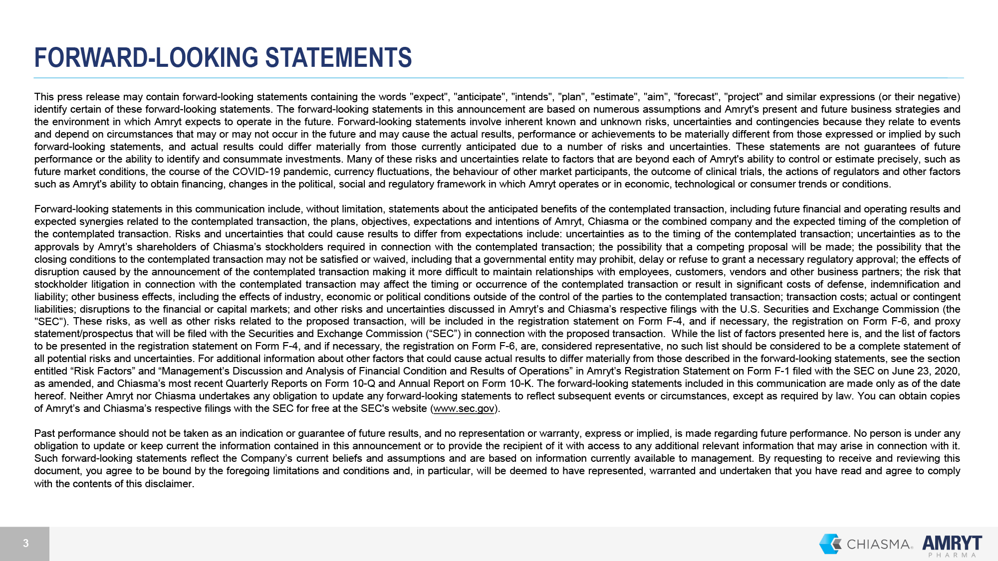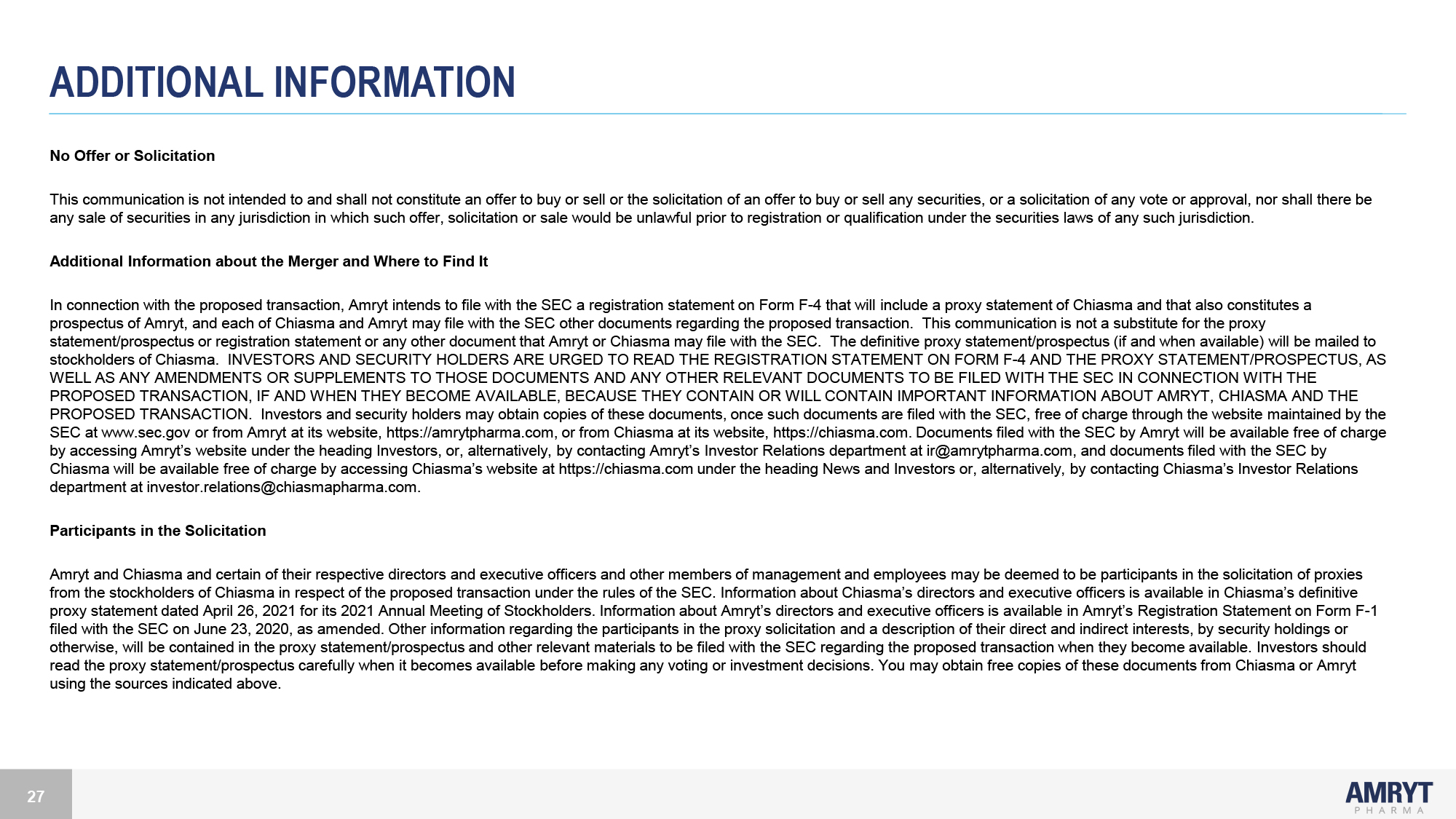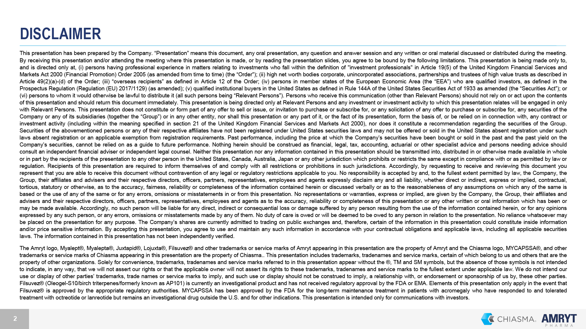 been independently verified. The Amryt logo, Myalept®, Myalepta®, Juxtapid®, Lojuxta®, Filsuvez® and other trademarks or service marks of Amryt appearing in this presentation are the property of Amryt and the Chiasma logo, MYCAPSSA®, and other