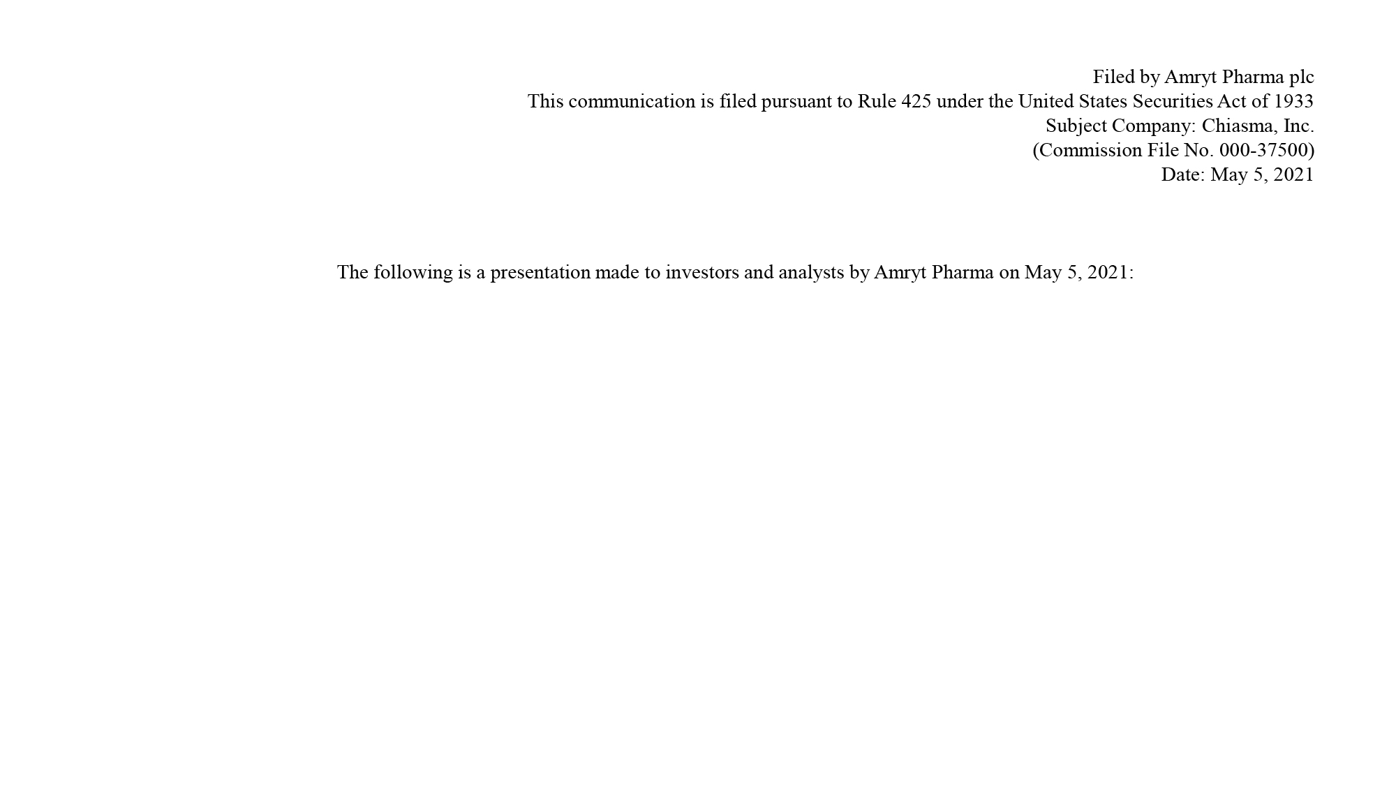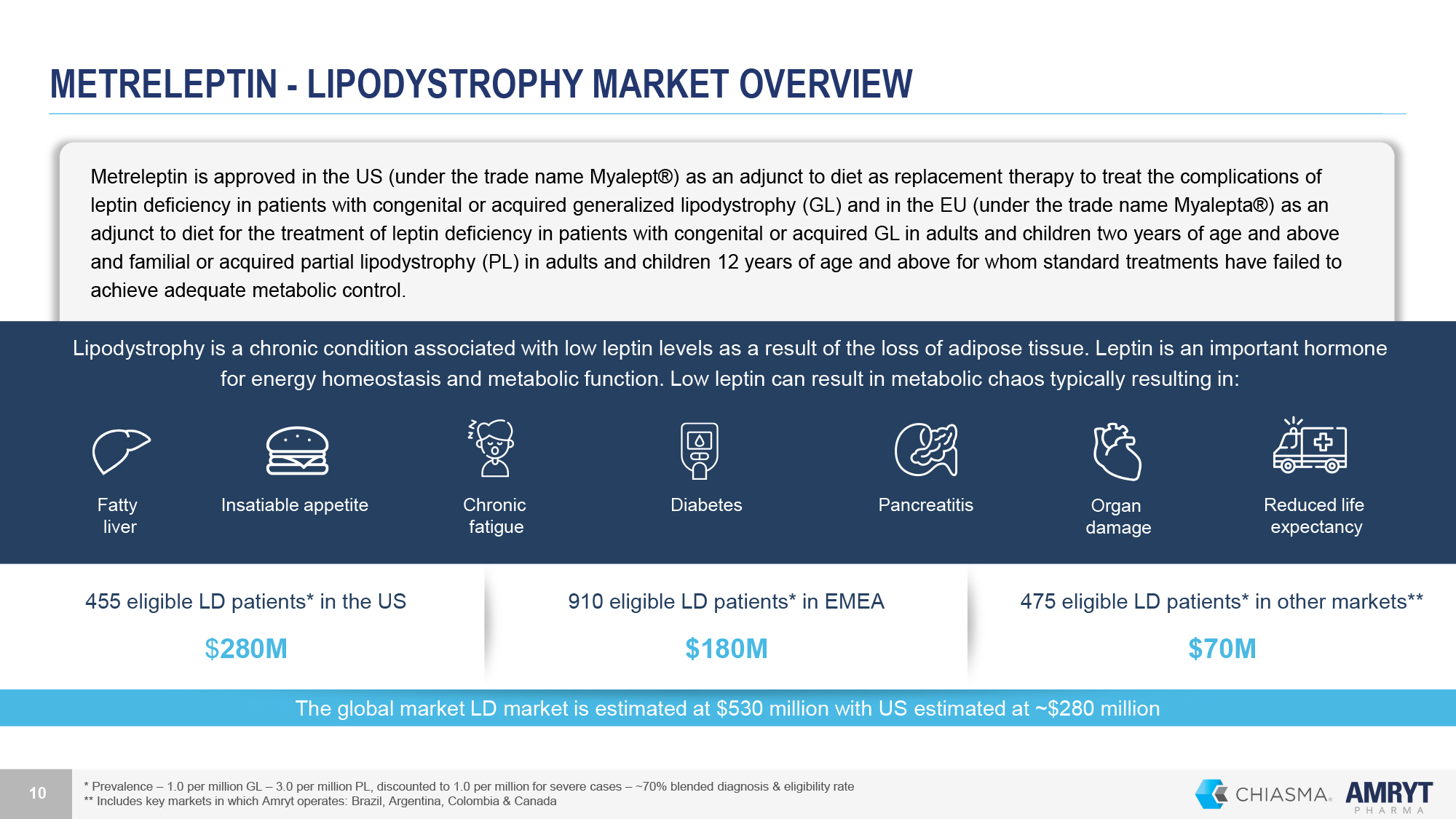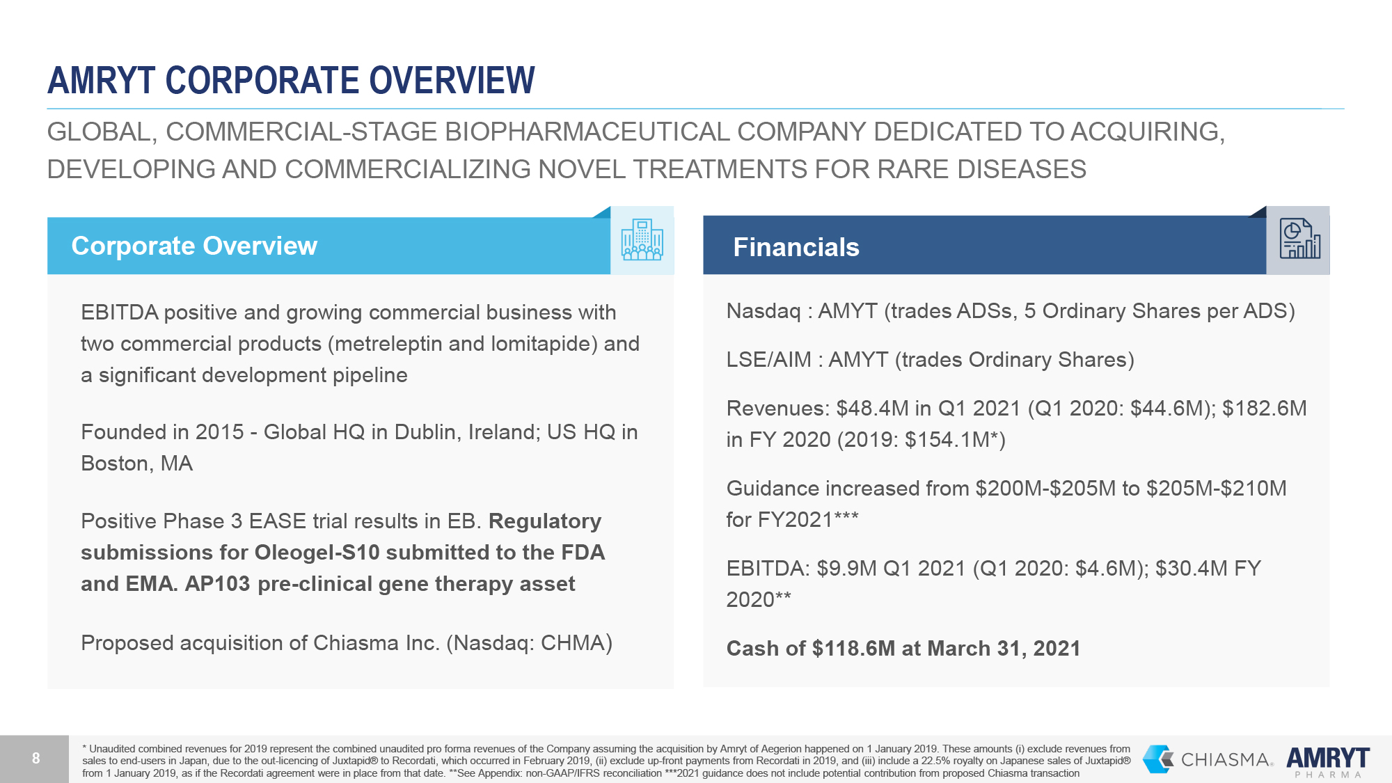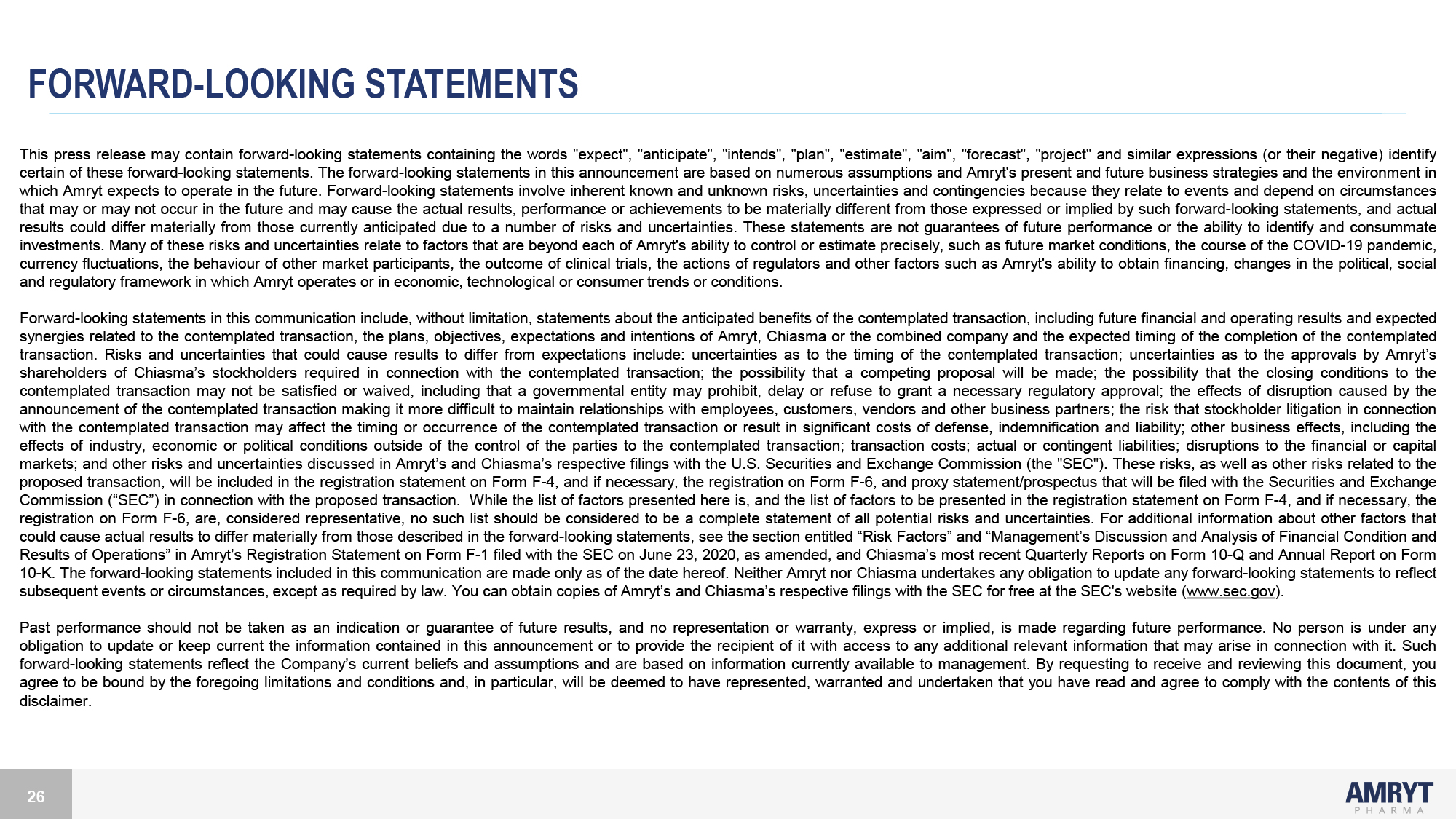 been independently verified. The Amryt logo, Myalept®, Myalepta®, Juxtapid®, Lojuxta®, Filsuvez® and other trademarks or service marks of Amryt appearing in this presentation are the property of Amryt and the Chiasma logo, MYCAPSSA®, and other