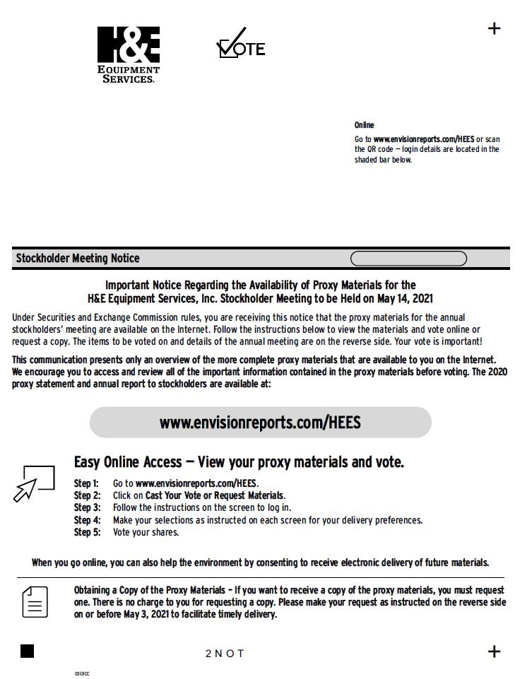 Here’s how to order a copy of the proxy materials and select delivery preferences: Current and future delivery requests can be submitted using the options below. If you request an email copy, you will receive an email with a link to the current meeting materials. PLEASE NOTE: You must use the number in the shaded bar on the reverse side when requesting a copy of the proxy materials. — Internet – Go to www.envisionreports.com/HEES. Click Cast Your Vote or Request Materials. — Phone – Call us free of charge at 1-866-641-4276. — Email – Send an email to investorvote@computershare.com with “Proxy Materials H&E Equipment Services, Inc.” in the subject line. Include your full name and address, plus the number located in the shaded bar on the reverse side, and state that you want a paper copy of the meeting materials. To facilitate timely delivery, all requests for a paper copy of proxy materials must be received by May 3, 2021. H&E Equipment Services, Inc.’s Annual Meeting of Stockholders will be held on May 14, 2021 at 7:30 a.m. Central Time virtually via the internet at www.meetingcenter.io/249562634. Proposals to be voted on at the meeting are listed below along with the Board of Directors’ recommendations. The Board of Directors recommends a vote FOR all the nominees listed and FOR Proposals 2-3: 1. Election of Directors: 01 - John M. Engquist 02 - Bradley W. Barber 03 - Paul N. Arnold 04 - Gary W. Bagley 05 - Bruce C. Bruckmann 06 - Patrick L. Edsell 07 - Thomas J. Galligan III 08 - Lawrence C. Karlson 09 - John T. Sawyer. 2. Ratification of appointment of BDO USA, LLP as independent registered public accounting firm for the year ending December 31, 2021. 3. Advisory vote on Named Executive Officer compensation as disclosed in the Proxy Statement. PLEASE NOTE – YOU CANNOT VOTE BY RETURNING THIS NOTICE. To vote your shares you must go online or request a paper copy of the proxy materials to receive a proxy card. Stockholder Meeting Notice