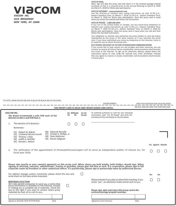 VIACOM INC. 1515 Broadway New York, New York 10036 2018 Annual Meeting Proxy Card The undersigned hereby appoints ROBERT M. BAKISH and CHRISTA A. D'ALIMONTE, and each of them, as proxy holders with full power of substitution, to represent and to vote on behalf of the undersigned all of the shares of Class A Common Stock of Viacom Inc. represented by this proxy at the 2018 Annual Meeting of Stockholders to be held on Thursday, March 8, 2018 at Viacom's corporate headquarters at 1515 Broadway, New York, New York, beginning at 9:00 a.m., Eastern Standard Time, and at any adjournments or postponements thereof, on the items of business set forth on the reserve side as more fully described in the Notice of 2018 Annual Meeting of Stockholders and Proxy Statement. THIS PROXY IS SOLICITED ON BEHALF OF THE BOARD OF DIRECTORS OF VIACOM INC. THIS PROXY, WHEN PROPERLY EXECUTED AND TIMELY RECEIVED PRIOR TO THE MEETING, WILL BE VOTED IN THE MANNER DIRECTED HEREIN BY THE UNDERSIGNED STOCKHOLDER. You are encouraged to specify your choices by marking the appropriate boxes, but you need not mark any boxes if you wish to vote in accordance with the Board of Directors' recommendations. The Board of Directors recommends a vote FOR each of the directors in item 1 and FOR item 2. Therefore, unless otherwise specified, the vote represented by this proxy will be cast FOR each of the directors in item 1 and FOR item 2. The proxy holders are directed to vote as specified on the reverse side hereof and in their discretion on all other matters. Attention 401(k) plan participants: If you hold shares of Viacom Inc. Class A Common Stock through the Viacom 401(k) plan, you should complete, sign and return this proxy card to instruct the trustee of the plan how to vote these shares. Your proxy must be received no later than 11:59 p.m., Eastern Standard Time, on March 5, 2018 so that the trustee of the plan (who votes the shares on behalf of plan participants) has adequate time to tabulate the voting instructions. Your voting instructions will be kept confidential. Address Changes/Comments: (If you noted any Address Changes/Comments above, please mark corresponding box on the reverse side.) Viacom Inc. c/o Broadridge 51 Mercedes Way Edgewood, NY 11717