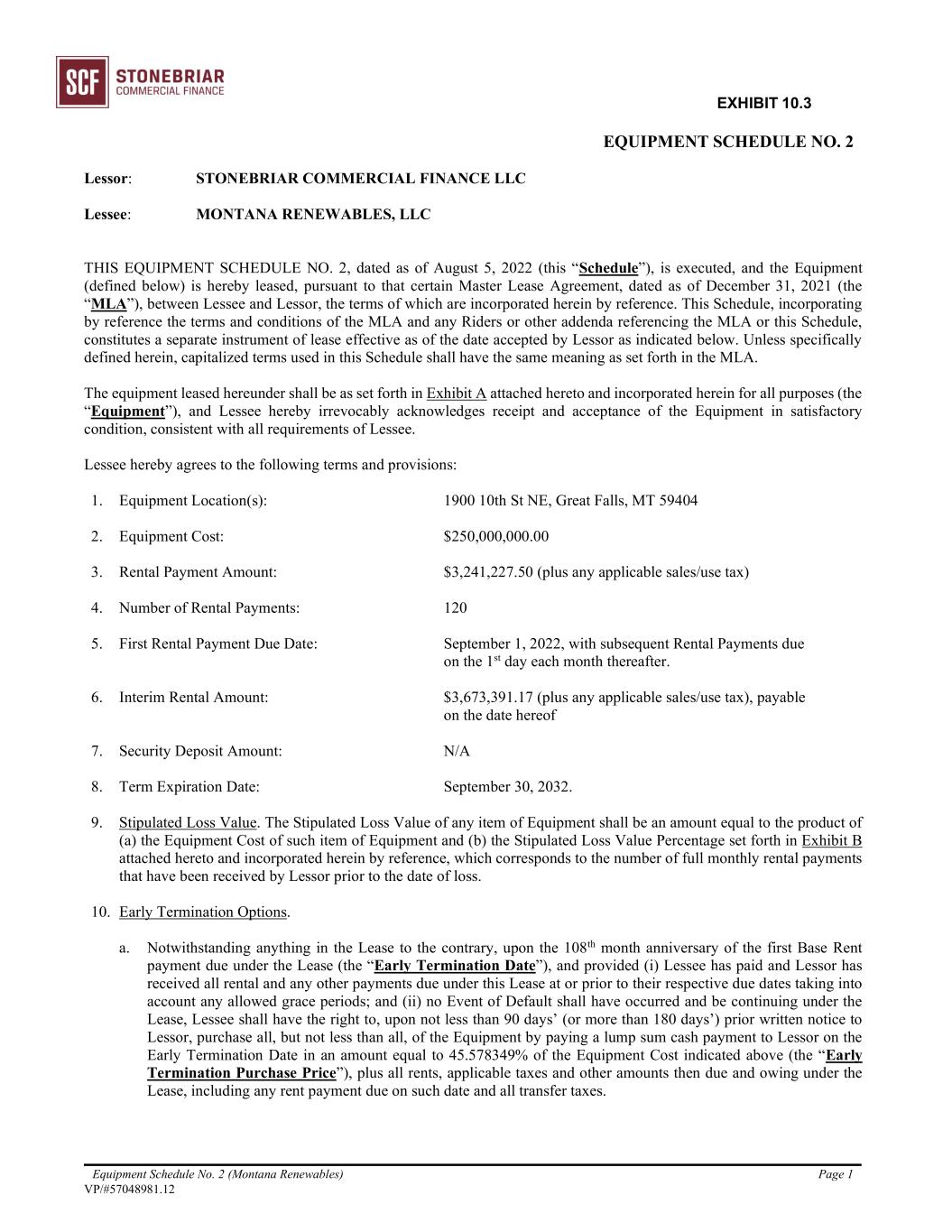 EXHIBIT 10.3 Equipment Schedule No. 2 (Montana Renewables) Page 1 VP/#57048981.12 EQUIPMENT SCHEDULE NO. 2 Lessor: STONEBRIAR COMMERCIAL FINANCE LLC Lessee: MONTANA RENEWABLES, LLC THIS EQUIPMENT SCHEDULE NO. 2, dated as of August 5, 2022 (this “Schedule”), is executed, and the Equipment (defined below) is hereby leased, pursuant to that certain Master Lease Agreement, dated as of December 31, 2021 (the “MLA”), between Lessee and Lessor, the terms of which are incorporated herein by reference. This Schedule, incorporating by reference the terms and conditions of the MLA and any Riders or other addenda referencing the MLA or this Schedule, constitutes a separate instrument of lease effective as of the date accepted by Lessor as indicated below. Unless specifically defined herein, capitalized terms used in this Schedule shall have the same meaning as set forth in the MLA. The equipment leased hereunder shall be as set forth in Exhibit A attached hereto and incorporated herein for all purposes (the “Equipment”), and Lessee hereby irrevocably acknowledges receipt and acceptance of the Equipment in satisfactory condition, consistent with all requirements of Lessee. Lessee hereby agrees to the following terms and provisions: 1. Equipment Location(s): 1900 10th St NE, Great Falls, MT 59404 2. Equipment Cost: $250,000,000.00 3. Rental Payment Amount: $3,241,227.50 (plus any applicable sales/use tax) 4. Number of Rental Payments: 120 5. First Rental Payment Due Date: September 1, 2022, with subsequent Rental Payments due on the 1st day each month thereafter. 6. Interim Rental Amount: $3,673,391.17 (plus any applicable sales/use tax), payable on the date hereof 7. Security Deposit Amount: N/A 8. Term Expiration Date: September 30, 2032. 9. Stipulated Loss Value. The Stipulated Loss Value of any item of Equipment shall be an amount equal to the product of (a) the Equipment Cost of such item of Equipment and (b) the Stipulated Loss Value Percentage set forth in Exhibit B attached hereto and incorporated herein by reference, which corresponds to the number of full monthly rental payments that have been received by Lessor prior to the date of loss. 10. Early Termination Options. a. Notwithstanding anything in the Lease to the contrary, upon the 108th month anniversary of the first Base Rent payment due under the Lease (the “Early Termination Date”), and provided (i) Lessee has paid and Lessor has received all rental and any other payments due under this Lease at or prior to their respective due dates taking into account any allowed grace periods; and (ii) no Event of Default shall have occurred and be continuing under the Lease, Lessee shall have the right to, upon not less than 90 days’ (or more than 180 days’) prior written notice to Lessor, purchase all, but not less than all, of the Equipment by paying a lump sum cash payment to Lessor on the Early Termination Date in an amount equal to 45.578349% of the Equipment Cost indicated above (the “Early Termination Purchase Price”), plus all rents, applicable taxes and other amounts then due and owing under the Lease, including any rent payment due on such date and all transfer taxes.