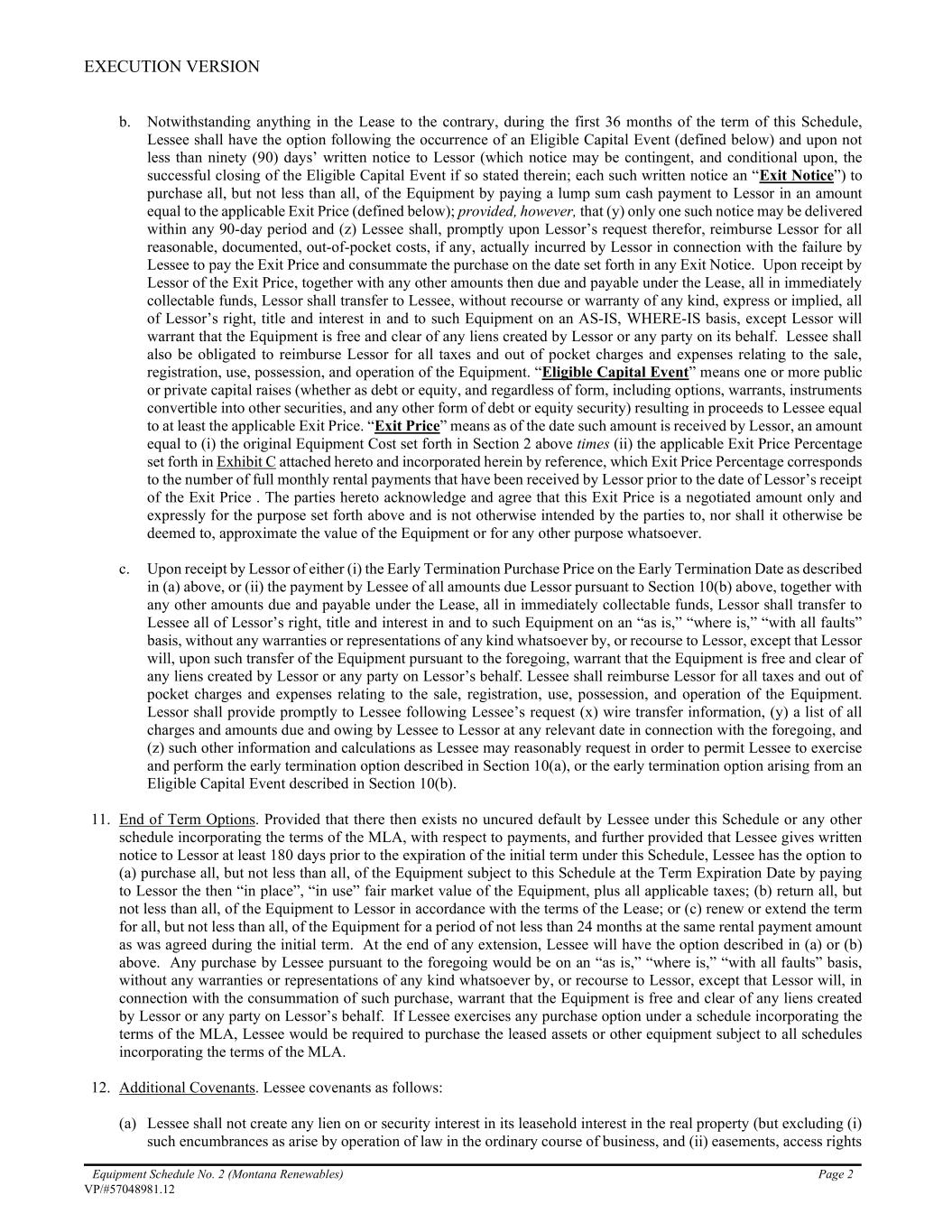 EXECUTION VERSION Equipment Schedule No. 2 (Montana Renewables) Page 2 VP/#57048981.12 b. Notwithstanding anything in the Lease to the contrary, during the first 36 months of the term of this Schedule, Lessee shall have the option following the occurrence of an Eligible Capital Event (defined below) and upon not less than ninety (90) days’ written notice to Lessor (which notice may be contingent, and conditional upon, the successful closing of the Eligible Capital Event if so stated therein; each such written notice an “Exit Notice”) to purchase all, but not less than all, of the Equipment by paying a lump sum cash payment to Lessor in an amount equal to the applicable Exit Price (defined below); provided, however, that (y) only one such notice may be delivered within any 90-day period and (z) Lessee shall, promptly upon Lessor’s request therefor, reimburse Lessor for all reasonable, documented, out-of-pocket costs, if any, actually incurred by Lessor in connection with the failure by Lessee to pay the Exit Price and consummate the purchase on the date set forth in any Exit Notice. Upon receipt by Lessor of the Exit Price, together with any other amounts then due and payable under the Lease, all in immediately collectable funds, Lessor shall transfer to Lessee, without recourse or warranty of any kind, express or implied, all of Lessor’s right, title and interest in and to such Equipment on an AS-IS, WHERE-IS basis, except Lessor will warrant that the Equipment is free and clear of any liens created by Lessor or any party on its behalf. Lessee shall also be obligated to reimburse Lessor for all taxes and out of pocket charges and expenses relating to the sale, registration, use, possession, and operation of the Equipment. “Eligible Capital Event” means one or more public or private capital raises (whether as debt or equity, and regardless of form, including options, warrants, instruments convertible into other securities, and any other form of debt or equity security) resulting in proceeds to Lessee equal to at least the applicable Exit Price. “Exit Price” means as of the date such amount is received by Lessor, an amount equal to (i) the original Equipment Cost set forth in Section 2 above times (ii) the applicable Exit Price Percentage set forth in Exhibit C attached hereto and incorporated herein by reference, which Exit Price Percentage corresponds to the number of full monthly rental payments that have been received by Lessor prior to the date of Lessor’s receipt of the Exit Price . The parties hereto acknowledge and agree that this Exit Price is a negotiated amount only and expressly for the purpose set forth above and is not otherwise intended by the parties to, nor shall it otherwise be deemed to, approximate the value of the Equipment or for any other purpose whatsoever. c. Upon receipt by Lessor of either (i) the Early Termination Purchase Price on the Early Termination Date as described in (a) above, or (ii) the payment by Lessee of all amounts due Lessor pursuant to Section 10(b) above, together with any other amounts due and payable under the Lease, all in immediately collectable funds, Lessor shall transfer to Lessee all of Lessor’s right, title and interest in and to such Equipment on an “as is,” “where is,” “with all faults” basis, without any warranties or representations of any kind whatsoever by, or recourse to Lessor, except that Lessor will, upon such transfer of the Equipment pursuant to the foregoing, warrant that the Equipment is free and clear of any liens created by Lessor or any party on Lessor’s behalf. Lessee shall reimburse Lessor for all taxes and out of pocket charges and expenses relating to the sale, registration, use, possession, and operation of the Equipment. Lessor shall provide promptly to Lessee following Lessee’s request (x) wire transfer information, (y) a list of all charges and amounts due and owing by Lessee to Lessor at any relevant date in connection with the foregoing, and (z) such other information and calculations as Lessee may reasonably request in order to permit Lessee to exercise and perform the early termination option described in Section 10(a), or the early termination option arising from an Eligible Capital Event described in Section 10(b). 11. End of Term Options. Provided that there then exists no uncured default by Lessee under this Schedule or any other schedule incorporating the terms of the MLA, with respect to payments, and further provided that Lessee gives written notice to Lessor at least 180 days prior to the expiration of the initial term under this Schedule, Lessee has the option to (a) purchase all, but not less than all, of the Equipment subject to this Schedule at the Term Expiration Date by paying to Lessor the then “in place”, “in use” fair market value of the Equipment, plus all applicable taxes; (b) return all, but not less than all, of the Equipment to Lessor in accordance with the terms of the Lease; or (c) renew or extend the term for all, but not less than all, of the Equipment for a period of not less than 24 months at the same rental payment amount as was agreed during the initial term. At the end of any extension, Lessee will have the option described in (a) or (b) above. Any purchase by Lessee pursuant to the foregoing would be on an “as is,” “where is,” “with all faults” basis, without any warranties or representations of any kind whatsoever by, or recourse to Lessor, except that Lessor will, in connection with the consummation of such purchase, warrant that the Equipment is free and clear of any liens created by Lessor or any party on Lessor’s behalf. If Lessee exercises any purchase option under a schedule incorporating the terms of the MLA, Lessee would be required to purchase the leased assets or other equipment subject to all schedules incorporating the terms of the MLA. 12. Additional Covenants. Lessee covenants as follows: (a) Lessee sha