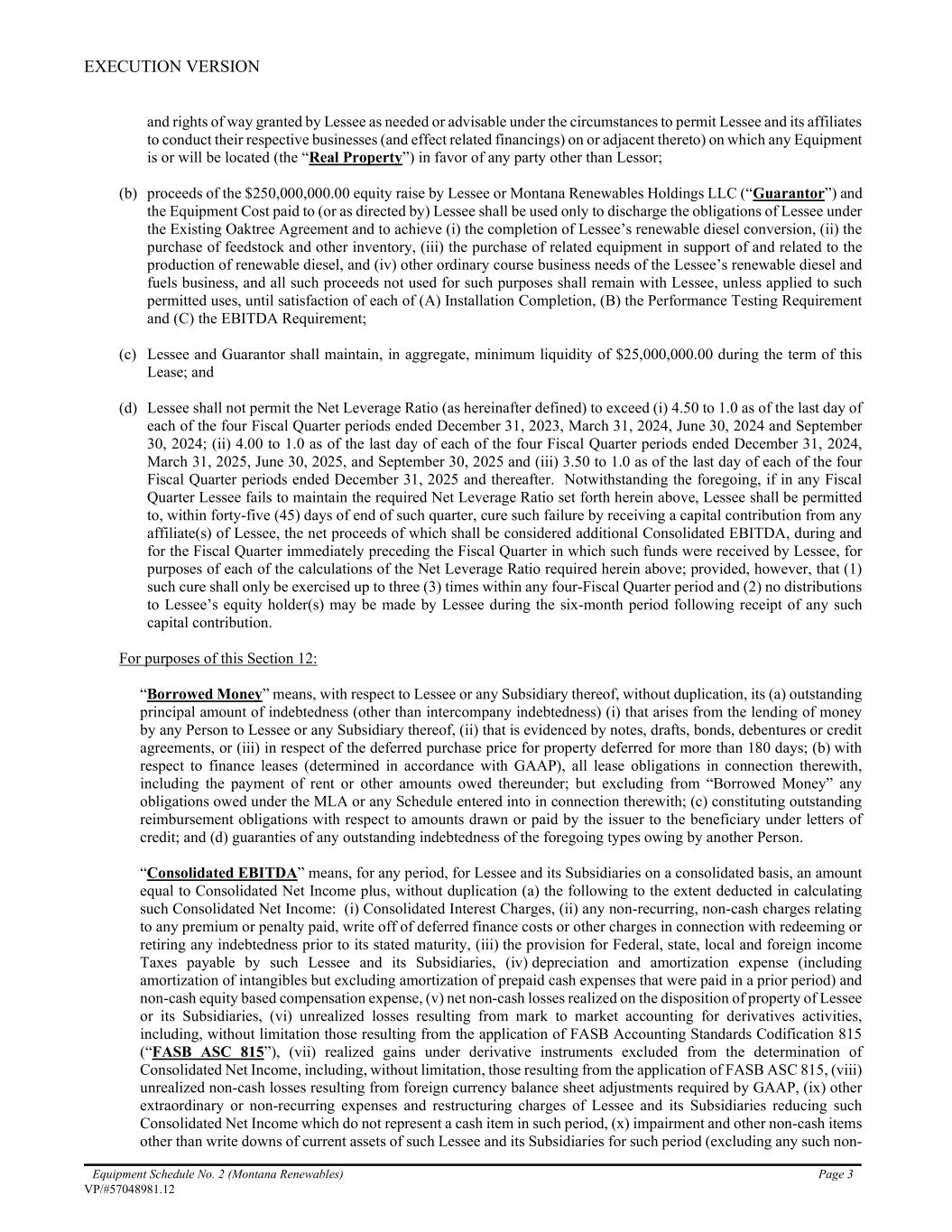 EXECUTION VERSION Equipment Schedule No. 2 (Montana Renewables) Page 3 VP/#57048981.12 and rights of way granted by Lessee as needed or advisable under the circumstances to permit Lessee and its affiliates to conduct their respective businesses (and effect related financings) on or adjacent thereto) on which any Equipment is or will be located (the “Real Property”) in favor of any party other than Lessor; (b) proceeds of the $250,000,000.00 equity raise by Lessee or Montana Renewables Holdings LLC (“Guarantor”) and the Equipment Cost paid to (or as directed by) Lessee shall be used only to discharge the obligations of Lessee under the Existing Oaktree Agreement and to achieve (i) the completion of Lessee’s renewable diesel conversion, (ii) the purchase of feedstock and other inventory, (iii) the purchase of related equipment in support of and related to the production of renewable diesel, and (iv) other ordinary course business needs of the Lessee’s renewable diesel and fuels business, and all such proceeds not used for such purposes shall remain with Lessee, unless applied to such permitted uses, until satisfaction of each of (A) Installation Completion, (B) the Performance Testing Requirement and (C) the EBITDA Requirement; (c) Lessee and Guarantor shall maintain, in aggregate, minimum liquidity of $25,000,000.00 during the term of this Lease; and (d) Lessee shall not permit the Net Leverage Ratio (as hereinafter defined) to exceed (i) 4.50 to 1.0 as of the last day of each of the four Fiscal Quarter periods ended December 31, 2023, March 31, 2024, June 30, 2024 and September 30, 2024; (ii) 4.00 to 1.0 as of the last day of each of the four Fiscal Quarter periods ended December 31, 2024, March 31, 2025, June 30, 2025, and September 30, 2025 and (iii) 3.50 to 1.0 as of the last day of each of the four Fiscal Quarter periods ended December 31, 2025 and thereafter. Notwithstanding the foregoing, if in any Fiscal Quarter Lessee fails to maintain the required Net Leverage Ratio set forth herein above, Lessee shall be permitted to, within forty-five (45) days of end of such quarter, cure such failure by receiving a capital contribution from any affiliate(s) of Lessee, the net proceeds of which shall be considered additional Consolidated EBITDA, during and for the Fiscal Quarter immediately preceding the Fiscal Quarter in which such funds were received by Lessee, for purposes of each of the calculations of the Net Leverage Ratio required herein above; provided, however, that (1) such cure shall only be exercised up to three (3) times within any four-Fiscal Quarter period and (2) no distributions to Lessee’s equity holder(s) may be made by Lessee during the six-month period following receipt of any such capital contribution. For purposes of this Section 12: “Borrowed Money” means, with respect to Lessee or any Subsidiary thereof, without duplication, its (a) outstanding principal amount of indebtedness (other than intercompany indebtedness) (i) that arises from the lending of money by any Person to Lessee or any Subsidiary thereof, (ii) that is evidenced by notes, drafts, bonds, debentures or credit agreements, or (iii) in respect of the deferred purchase price for property deferred for more than 180 days; (b) with respect to finance leases (determined in accordance with GAAP), all lease obligations in connection therewith, including the payment of rent or other amounts owed thereunder; but excluding from “Borrowed Money” any obligations owed under the MLA or any Schedule entered into in connection therewith; (c) constituting outstanding reimbursement obligations with respect to amounts drawn or paid by the issuer to the beneficiary under letters of credit; and (d) guaranties of any outstanding indebtedness of the foregoing types owing by another Person. “Consolidated EBITDA” means, for any period, for Lessee and its Subsidiaries on a consolidated basis, an amount equal to Consolidated Net Income plus, without duplication (a) the following to the extent deducted in calculating such Consolidated Net Income: (i) Consolidated Interest Charges, (ii) any non-recurring, non-cash charges relating to any premium or penalty paid, write off of deferred finance costs or other charges in connection with redeeming or retiring any indebtedness prior to its stated maturity, (iii) the provision for Federal, state, local and foreign income Taxes payable by such Lessee and its Subsidiaries, (iv) depreciation and amortization expense (including amortization of intangibles but excluding amortization of prepaid cash expenses that were paid in a prior period) and non-cash equity based compensation expense, (v) net non-cash losses realized on the disposition of property of Lessee or its Subsidiaries, (vi) unrealized losses resulting from mark to market accounting for derivatives activities, including, without limitation those resulting from the application of FASB Accounting Standards Codification 815 (“FASB ASC 815”), (vii) realized gains under derivative instruments excluded from the determination of Consolidated Net Income, including, without limitation, those resulting from the application of FASB ASC 815, (viii) unrealized non-cash losses resulting from foreign currency balance sheet adjustments required by GAAP, (ix) other extraordinary or non-recurring expenses and restructuring charges of Lessee and its Subsidiaries reducing such Consolidated Net Income which do not represent a cash item in such period, (x) impairment and other non-cash items other than write downs of current assets of such Lessee and its Subsidiaries for such period (excluding any such non-