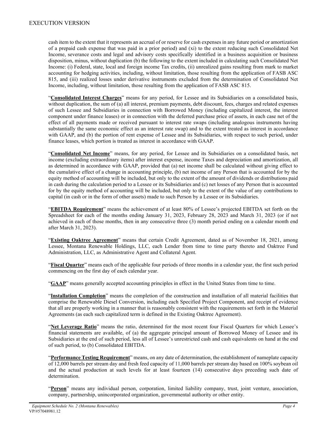 EXECUTION VERSION Equipment Schedule No. 2 (Montana Renewables) Page 4 VP/#57048981.12 cash item to the extent that it represents an accrual of or reserve for cash expenses in any future period or amortization of a prepaid cash expense that was paid in a prior period) and (xi) to the extent reducing such Consolidated Net Income, severance costs and legal and advisory costs specifically identified in a business acquisition or business disposition, minus, without duplication (b) the following to the extent included in calculating such Consolidated Net Income: (i) Federal, state, local and foreign income Tax credits, (ii) unrealized gains resulting from mark to market accounting for hedging activities, including, without limitation, those resulting from the application of FASB ASC 815, and (iii) realized losses under derivative instruments excluded from the determination of Consolidated Net Income, including, without limitation, those resulting from the application of FASB ASC 815. “Consolidated Interest Charges” means for any period, for Lessee and its Subsidiaries on a consolidated basis, without duplication, the sum of (a) all interest, premium payments, debt discount, fees, charges and related expenses of such Lessee and Subsidiaries in connection with Borrowed Money (including capitalized interest, the interest component under finance leases) or in connection with the deferred purchase price of assets, in each case net of the effect of all payments made or received pursuant to interest rate swaps (including analogous instruments having substantially the same economic effect as an interest rate swap) and to the extent treated as interest in accordance with GAAP, and (b) the portion of rent expense of Lessee and its Subsidiaries, with respect to such period, under finance leases, which portion is treated as interest in accordance with GAAP. “Consolidated Net Income” means, for any period, for Lessee and its Subsidiaries on a consolidated basis, net income (excluding extraordinary items) after interest expense, income Taxes and depreciation and amortization, all as determined in accordance with GAAP, provided that (a) net income shall be calculated without giving effect to the cumulative effect of a change in accounting principle, (b) net income of any Person that is accounted for by the equity method of accounting will be included, but only to the extent of the amount of dividends or distributions paid in cash during the calculation period to a Lessee or its Subsidiaries and (c) net losses of any Person that is accounted for by the equity method of accounting will be included, but only to the extent of the value of any contributions to capital (in cash or in the form of other assets) made to such Person by a Lessee or its Subsidiaries. “EBITDA Requirement” means the achievement of at least 80% of Lessee’s projected EBITDA set forth on the Spreadsheet for each of the months ending January 31, 2023, February 28, 2023 and March 31, 2023 (or if not achieved in each of those months, then in any consecutive three (3) month period ending on a calendar month end after March 31, 2023). “Existing Oaktree Agreement” means that certain Credit Agreement, dated as of November 18, 2021, among Lessee, Montana Renewable Holdings, LLC, each Lender from time to time party thereto and Oaktree Fund Administration, LLC, as Administrative Agent and Collateral Agent. “Fiscal Quarter” means each of the applicable four periods of three months in a calendar year, the first such period commencing on the first day of each calendar year. “GAAP” means generally accepted accounting principles in effect in the United States from time to time. “Installation Completion” means the completion of the construction and installation of all material facilities that comprise the Renewable Diesel Conversion, including each Specified Project Component, and receipt of evidence that all are properly working in a manner that is reasonably consistent with the requirements set forth in the Material Agreements (as each such capitalized term is defined in the Existing Oaktree Agreement). “Net Leverage Ratio” means the ratio, determined for the most recent four Fiscal Quarters for which Lessee’s financial statements are available, of (a) the aggregate principal amount of Borrowed Money of Lessee and its Subsidiaries at the end of such period, less all of Lessee’s unrestricted cash and cash equivalents on hand at the end of such period, to (b) Consolidated EBITDA. “Performance Testing Requirement” means, on any date of determination, the establishment of nameplate capacity of 12,000 barrels per stream day and fresh feed capacity of 11,000 barrels per stream day based on 100% soybean oil and the actual production at such levels for at least fourteen (14) consecutive days preceding such date of determination. “Person” means any individual person, corporation, limited liability company, trust, joint venture, association, company, partnership, unincorporated organization, governmental authority or other entity.