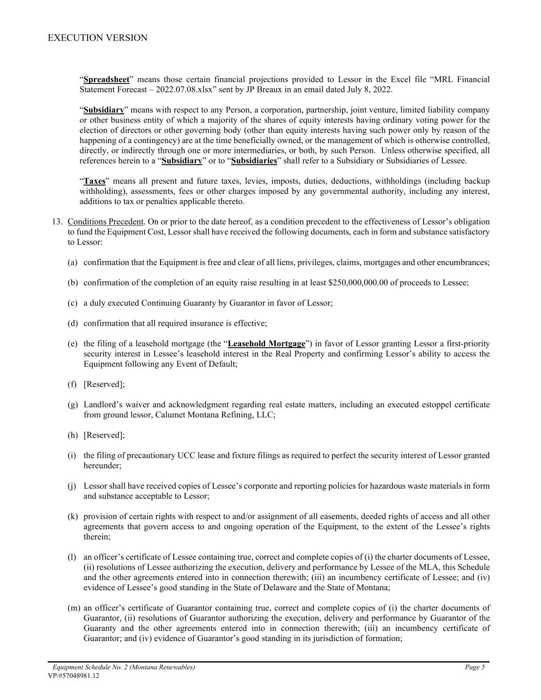 EXECUTION VERSION Equipment Schedule No. 2 (Montana Renewables) Page 5 VP/#57048981.12 “Spreadsheet” means those certain financial projections provided to Lessor in the Excel file “MRL Financial Statement Forecast – 2022.07.08.xlsx” sent by JP Breaux in an email dated July 8, 2022. “Subsidiary” means with respect to any Person, a corporation, partnership, joint venture, limited liability company or other business entity of which a majority of the shares of equity interests having ordinary voting power for the election of directors or other governing body (other than equity interests having such power only by reason of the happening of a contingency) are at the time beneficially owned, or the management of which is otherwise controlled, directly, or indirectly through one or more intermediaries, or both, by such Person. Unless otherwise specified, all references herein to a “Subsidiary” or to “Subsidiaries” shall refer to a Subsidiary or Subsidiaries of Lessee. “Taxes” means all present and future taxes, levies, imposts, duties, deductions, withholdings (including backup withholding), assessments, fees or other charges imposed by any governmental authority, including any interest, additions to tax or penalties applicable thereto. 13. Conditions Precedent. On or prior to the date hereof, as a condition precedent to the effectiveness of Lessor’s obligation to fund the Equipment Cost, Lessor shall have received the following documents, each in form and substance satisfactory to Lessor: (a) confirmation that the Equipment is free and clear of all liens, privileges, claims, mortgages and other encumbrances; (b) confirmation of the completion of an equity raise resulting in at least $250,000,000.00 of proceeds to Lessee; (c) a duly executed Continuing Guaranty by Guarantor in favor of Lessor; (d) confirmation that all required insurance is effective; (e) the filing of a leasehold mortgage (the “Leasehold Mortgage”) in favor of Lessor granting Lessor a first-priority security interest in Lessee’s leasehold interest in the Real Property and confirming Lessor’s ability to access the Equipment following any Event of Default; (f) [Reserved]; (g) Landlord’s waiver and acknowledgment regarding real estate matters, including an executed estoppel certificate from ground lessor, Calumet Montana Refining, LLC; (h) [Reserved]; (i) the filing of precautionary UCC lease and fixture filings as required to perfect the security interest of Lessor granted hereunder; (j) Lessor shall have received copies of Lessee’s corporate and reporting policies for hazardous waste materials in form and substance acceptable to Lessor; (k) provision of certain rights with respect to and/or assignment of all easements, deeded rights of access and all other agreements that govern access to and ongoing operation of the Equipment, to the extent of the Lessee’s rights therein; (l) an officer’s certificate of Lessee containing true, correct and complete copies of (i) the charter documents of Lessee, (ii) resolutions of Lessee authorizing the execution, delivery and performance by Lessee of the MLA, this Schedule and the other agreements entered into in connection therewith; (iii) an incumbency certificate of Lessee; and (iv) evidence of Lessee’s good standing in the State of Delaware and the State of Montana; (m) an officer’s certificate of Guarantor containing true, correct and complete copies of (i) the charter documents of Guarantor, (ii) resolutions of Guarantor authorizing the execution, delivery and performance by Guarantor of the Guaranty and the other agreements entered into in connection therewith; (iii) an incumbency certificate of Guarantor; and (iv) evidence of Guarantor’s good standing in its jurisdiction of formation;