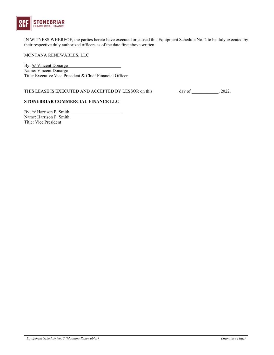 Equipment Schedule No. 2 (Montana Renewables) (Signature Page) IN WITNESS WHEREOF, the parties hereto have executed or caused this Equipment Schedule No. 2 to be duly executed by their respective duly authorized officers as of the date first above written. MONTANA RENEWABLES, LLC By: /s/ Vincent Donargo Name: Vincent Donargo Title: Executive Vice President & Chief Financial Officer THIS LEASE IS EXECUTED AND ACCEPTED BY LESSOR on this day of ____________, 2022. STONEBRIAR COMMERCIAL FINANCE LLC By: /s/ Harrison P. Smith Name: Harrison P. Smith Title: Vice President