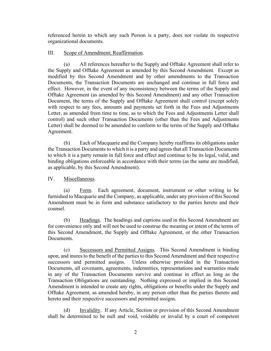 2 referenced herein to which any such Person is a party, does not violate its respective organizational documents. Scope of Amendment; Reaffirmation. (a) All references hereafter to the Supply and Offtake Agreement shall refer to the Supply and Offtake Agreement as amended by this Second Amendment. Except as modified by this Second Amendment and by other amendments to the Transaction Documents, the Transaction Documents are unchanged and continue in full force and effect. However, in the event of any inconsistency between the terms of the Supply and Offtake Agreement (as amended by this Second Amendment) and any other Transaction Document, the terms of the Supply and Offtake Agreement shall control (except solely with respect to any fees, amounts and payments set forth in the Fees and Adjustments Letter, as amended from time to time, as to which the Fees and Adjustments Letter shall control) and such other Transaction Documents (other than the Fees and Adjustments Letter) shall be deemed to be amended to conform to the terms of the Supply and Offtake Agreement. (b) Each of Macquarie and the Company hereby reaffirms its obligations under the Transaction Documents to which it is a party and agrees that all Transaction Documents to which it is a party remain in full force and effect and continue to be its legal, valid, and binding obligations enforceable in accordance with their terms (as the same are modified, as applicable, by this Second Amendment). Miscellaneous. (a) Form. Each agreement, document, instrument or other writing to be furnished to Macquarie and the Company, as applicable, under any provision of this Second Amendment must be in form and substance satisfactory to the parties hereto and their counsel. (b) Headings. The headings and captions used in this Second Amendment are for convenience only and will not be used to construe the meaning or intent of the terms of this Second Amendment, the Supply and Offtake Agreement, or the other Transaction Documents. (c) Successors and Permitted Assigns. This Second Amendment is binding upon, and inures to the benefit of the parties to this Second Amendment and their respective successors and permitted assigns. Unless otherwise provided in the Transaction Documents, all covenants, agreements, indemnities, representations and warranties made in any of the Transaction Documents survive and continue in effect as long as the Transaction Obligations are outstanding. Nothing expressed or implied in this Second Amendment is intended to create any rights, obligations or benefits under the Supply and Offtake Agreement, as amended hereby, in any person other than the parties thereto and hereto and their respective successors and permitted assigns. (d) Invalidity. If any Article, Section or provision of this Second Amendment shall be determined to be null and void, voidable or invalid by a court of competent