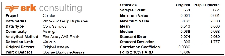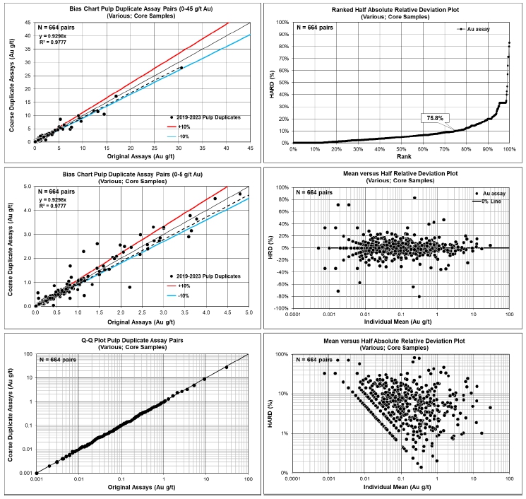 Bias Charts and Precision Plots for Pulp Duplicate Samples Analyzed Between 2019 and 2023 for Camp, Soledad, Los Cuyes and Enma Deposits