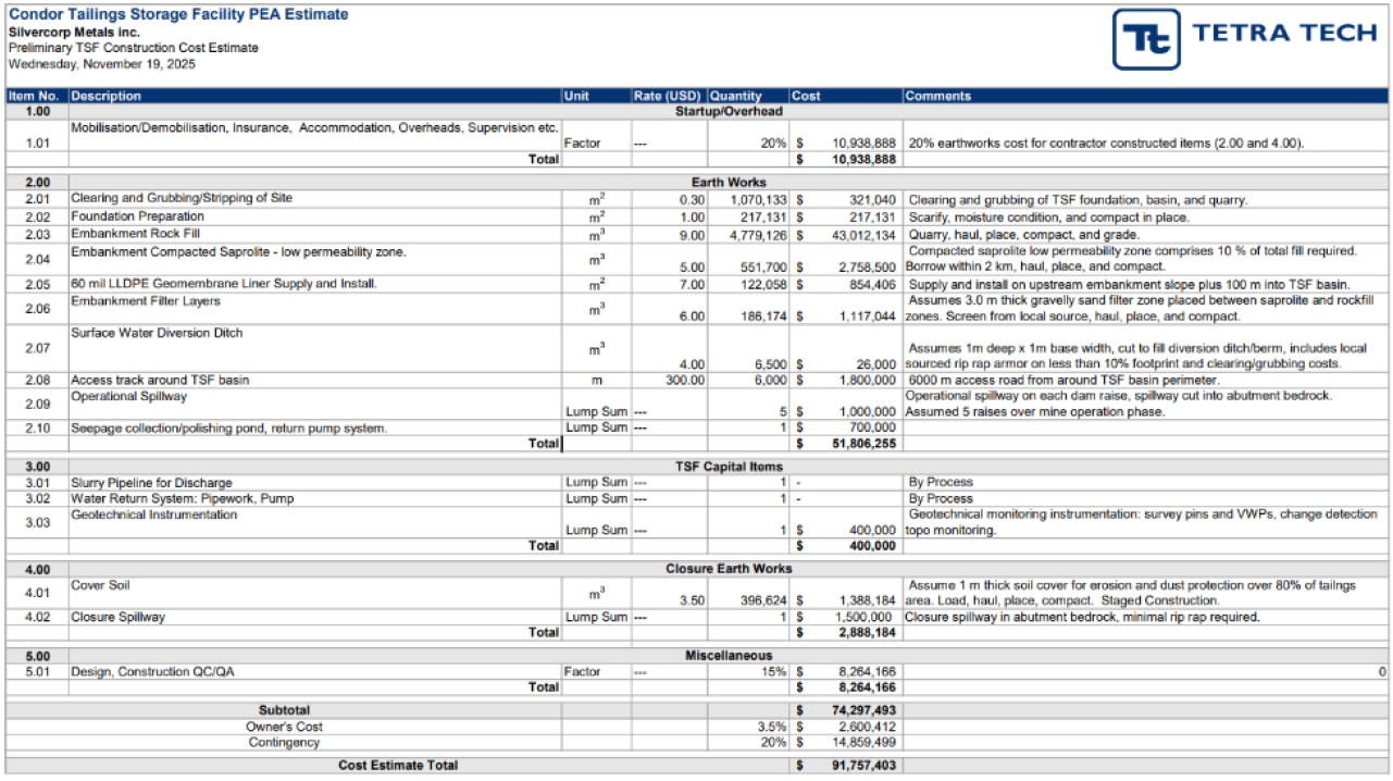 | ▪ | Advance TSF design detail to prefeasibility level, including construction sequence and cost estimate update. US$100k. |