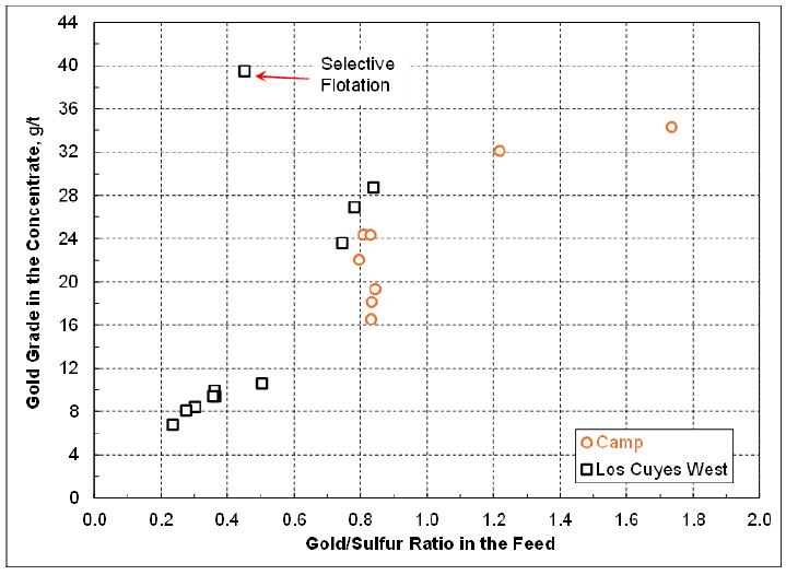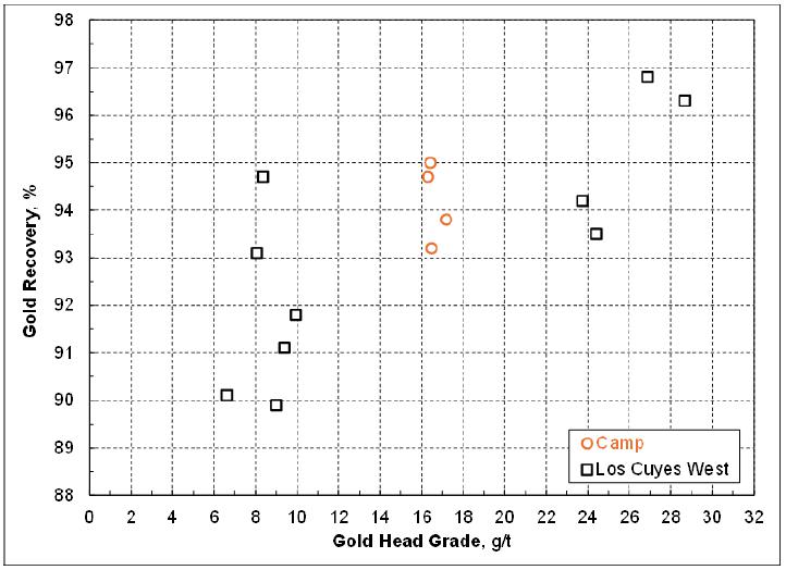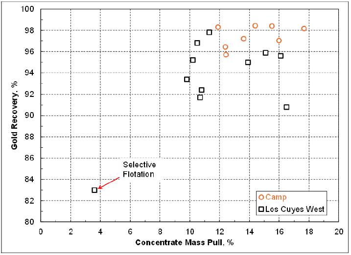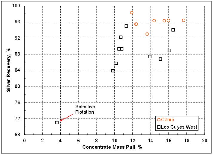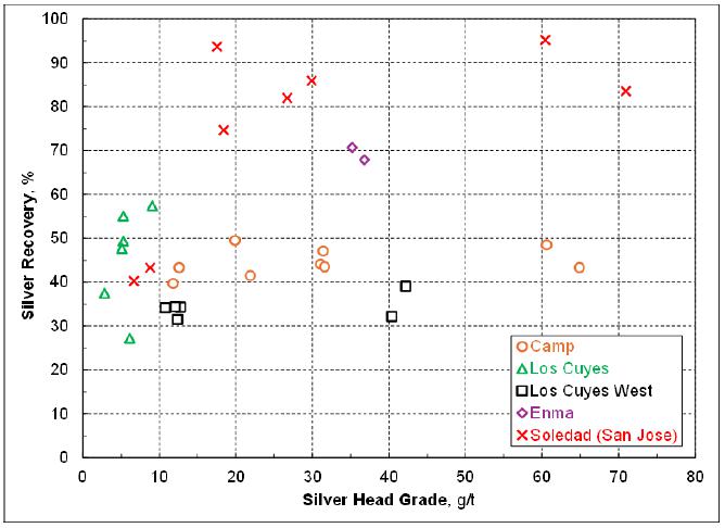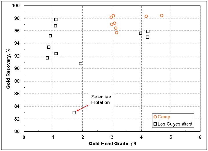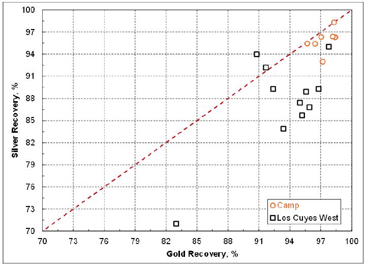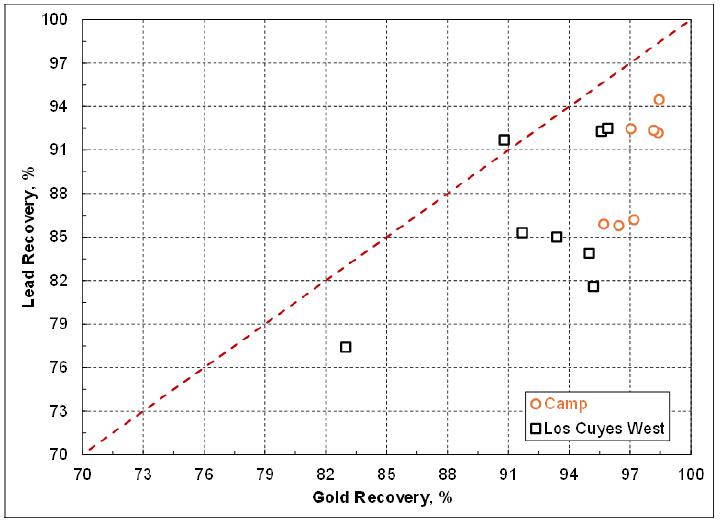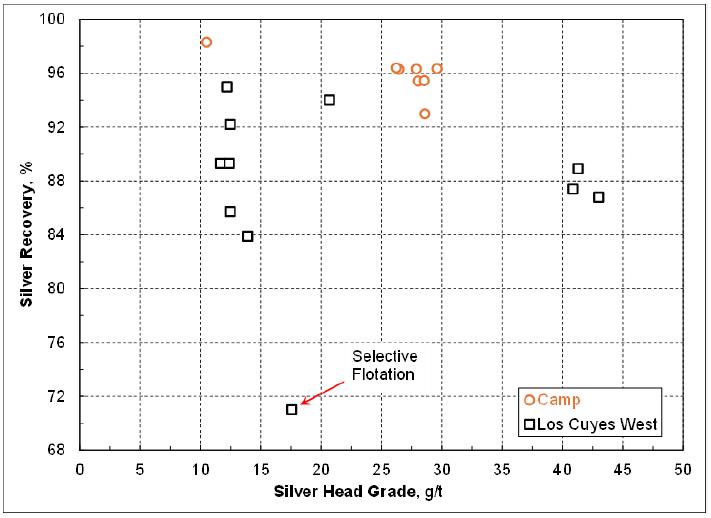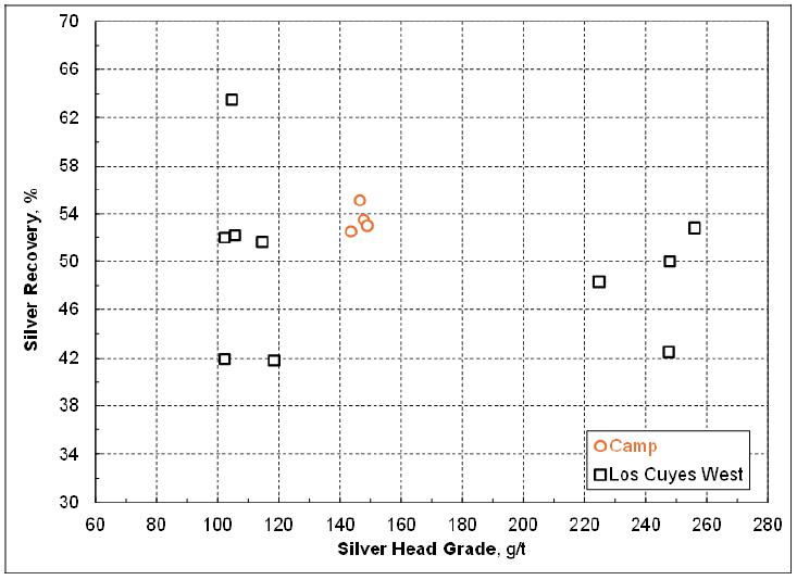 | ▪ | The cyanide leach tail after cyanide destruction has never been tested for the sequential selective flotation to generate the lead/silver concentrate and zinc/silver concentrate. The oxidizing nature during cyanide destruction may deteriorate the subsequent flotation performance. Although the economic contribution by these two flotation concentrates will be marginal, a series of flotation tests are needed to verify the marketable lead/silver concentrate and zinc/silver concentrate can indeed be produced consistently. Previous testwork data showed the concentrates produced from the Los Cuyes West domain contained high levels of arsenic, cadmium and antimony. The assays of these penalty elements plus mercury, chloride and fluoride, etc should be repeated when the representative flotation concentrates become available. |