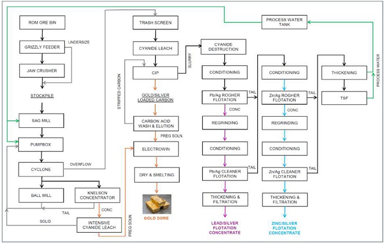 | ▪ | The single-stage gravity concentration at grind size of 80% passing 210 µm was exclusively carried out. The multi-stage gravity concentration testwork is strongly recommended for each domain. The gravity recoverable gold will likely increase with the multi-stage gravity concentration. After the testwork data from the multi-stage gravity concentration are obtained, a series of simulations are recommended to forecast the expected gold recovery from the future commercial operations. For the whole-ore cyanide leach, optimization testwork is recommended to fine tune the operating conditions, including the pulp density, grind size, cyanide concentration, pH, dissolved oxygen and retention time. Previous cyanide leach testwork showed a weak preg-robbing with some materials, and this should be verified by carrying out the parallel CIL cyanide leach and CIP cyanide leach, and then compare their gold recoveries. The adsorption behaviour of dissolved gold and silver on the activated carbon should be determined using the actual pregnant leachate. The dissolved silver does not adsorb strongly on the activated carbon and thus some of the dissolved silver may be lost to the CIP tail in the future commercial operation. Also, some dissolved copper and zinc are present in the pregnant leachate, and they may adversely impact the loading of gold and silver on the activated carbon. When the process water is recycled, the dissolved copper and zinc will build up in the process water. |