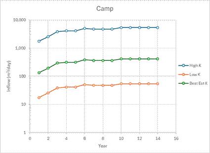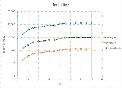 | ▪ | Field data for assessing the hydrogeological system should be collected as part of either exploration or mine geotechnical drilling. This work could consist of packer based injection test to determine hydraulic conductivity (K) and/or installation of monitoring wells for K testing and water quality sampling. Hydraulic testing of geological structures should be carried out when possible as these are likely to be the dominant inflow paths/features. US$500k. |