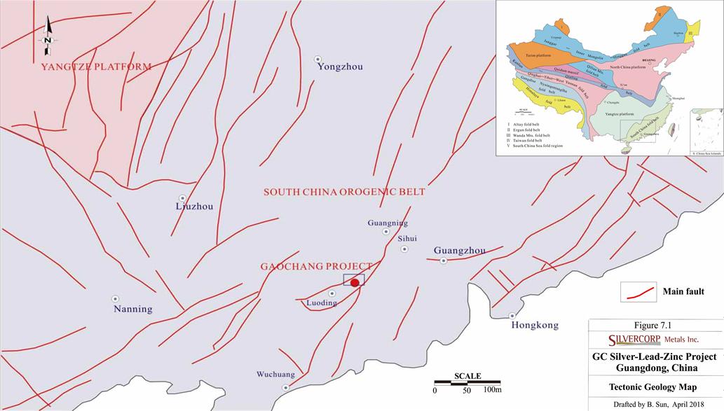 The Property is located on the east margin of the Luoding basin, east of the Wuchuan – Sihui major fault within the north portion of the Yunkai uplift of the South China Orogenic Belt. North-east striking structures and arc structures form the basic geological framework of the region. Deposits on the Property occur at the intersection of a north-easterly striking fault zone and a near east-westerly striking fault zone.