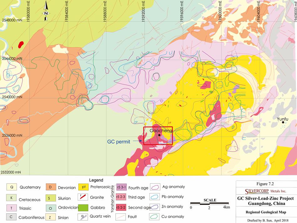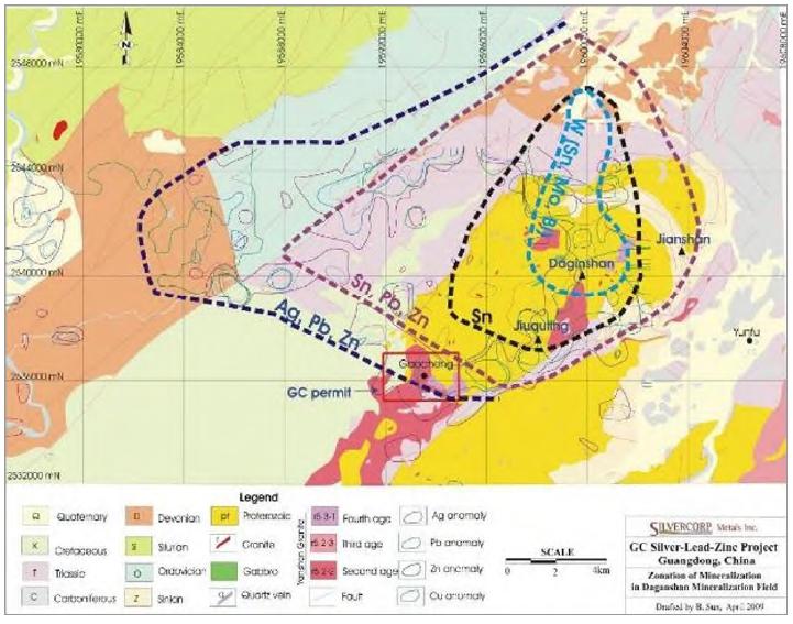 Basement rocks within the Property encompass quartz sandstone, meta-carbonaceous siltstone, carbonaceous phyllite, calcareous quartzite, and argillaceous limestone of the Sinian Daganshan Formation; quartz sandstone and shale of the Triassic Xiaoyunwushan Formation, and sandy conglomerate and conglomerate of the Cretaceous Luoding Formation. These rocks are intruded by Paleozoic gneissic, medium-grained biotite granite, and Mesozoic fine- to medium-grained adamellite, brownish, fine-grained, biotite mylonite, granite porphyry, quartz porphyry, diabase, and aplite. The Mesozoic intrusives intruded along the south and south-west contacts of the Paleozoic granites. The majority of Ag-Zn-Pb mineralization is hosted by the Mesozoic granite. The granite dips south and strikes west north-west, parallel to the majority of mineralized veins on the GC property.