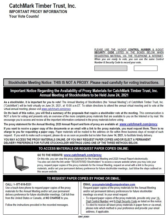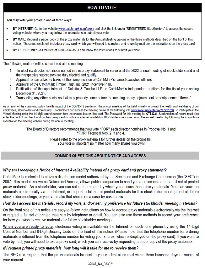 You may vote your proxy in one of three ways: ·BY INTERNET: Go to the website www.catchmark.com/proxy and click the link under “REGISTERED Stockholders” to access the secure voting website, where you may follow the instructions to submit your vote. ·BY MAIL: Request a paper copy of the proxy materials for the Annual Meeting via one of the three methods described on the front of this notice. These materials will include a proxy card, which you will need to complete and return by mail per the instructions on the proxy card. ·BY TELEPHONE: Call toll-free at 1-800-337-3503 and follow the instructions to submit your vote. The following matters will be considered at the meeting:1. To elect six director nominees named in this proxy statement to serve until the 2022 annual meeting of stockholders and until their respective successors are duly elected and qualify.2. Approval, on an advisory basis, of the compensation of CatchMark’s named executive officers.3. Approval of the CatchMark Timber Trust, Inc. 2021 Incentive Plan.4. Ratification of the appointment of Deloitte & Touche LLP as CatchMark’s independent auditors for the fiscal year ending December 31, 2021.5. Transacting any other business that may properly come before the meeting or any adjournment or postponement thereof.As a result of the continuing public health impact of the COVID-19 pandemic, the annual meeting will be held virtually to protect the health and well-being of our employees, stockholders and community. Stockholders can access the meeting online at the following link: www.meetingcenter.io/207215756. To Participate in the Virtual Meeting enter the 14-digit control number from the shaded box on this card. The Password for this meeting is: CTT2021. Stockholders of record must also enter the control number found on their proxy card or notice of internet availability. Stockholders may vote during the annual meeting by following the instructions available on the meeting website during the annual meeting.The Board of Directors recommends that you vote “FOR” each director nominee in Proposal No. 1 and“FOR” Proposal Nos. 2, 3 and 4.Please refer to the proxy materials for further details on the proposals.Your vote is important no matter how many shares you own!COMMON QUESTIONS ABOUT NOTICE AND ACCESSWhy am I receiving a Notice of Internet Availability instead of a proxy card and proxy statement?CatchMark has elected to utilize a distribution model authorized by the Securities and Exchange Commission (the “SEC”) in 2007. This model, known as Notice and Access, allows public companies to send you a notice instead of a full set of printed proxy materials. As a stockholder, you can select the means by which you access these proxy materials. You can view the materials electronically via the Internet, or request a full set of printed materials for this stockholder meeting and all future stockholder meetings, or you can make that choice on a case-by-case basis.How do I access the materials, record my vote, and/or set my preference for future stockholder meeting materials?On the front side of this notice are easy-to-follow instructions on how to access proxy materials electronically via the Internet or request a full set of printed materials by telephone or email. You can also use these methods to record your preference for how you wish to receive materials for future stockholder meetings.When you are ready to vote, electronic voting is available via the Internet or touch-tone phone by using the 14-Digit Control Number and 8-Digit Security Code on the front of this notice. (Please note that the telephone number for ordering materials is different from the telephone number for voting your shares, which is displayed on the proxy card). If you want to vote by mail, you will need to use a proxy card, which you can receive by requesting a paper copy of the proxy materials.If I request printed proxy materials, how long will it take for me to receive them?The SEC rule requires that the proxy materials be sent to you via first-class mail within three business days of receipt of your request.32047_NA_033021