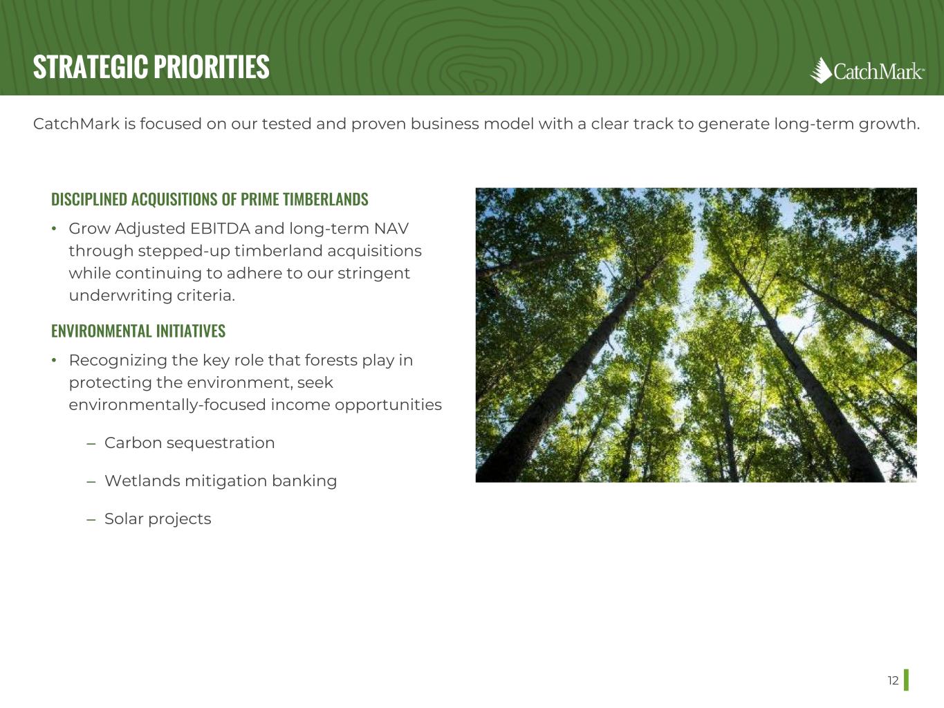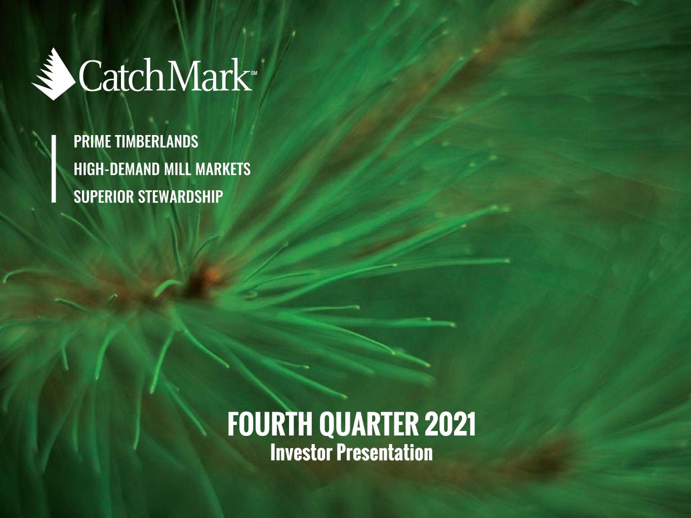 FORWARD-LOOKING STATEMENTS This presentation contains forward-looking statements within the meaning of Section 27A of the Securities Act of 1933 and Section 21E of the Securities Exchange Act of 1934, as amended. Such forward-looking statements can generally be identified by our use of forward-looking terminology such as "may," "will," "expect," "intend," "anticipate," "estimate," "believe," "continue," or other similar words. However, the absence of these or similar words or expressions does not mean that a statement is not forward-looking. Forward-looking statements are not guarantees of performance and are based on certain assumptions, discuss future expectations, describe plans and strategies, contain projections of results of operations or of financial condition or state other forward-looking information. Forward-looking statements in this presentation include, but are not limited to, that we seek to capture the highest value per acre and to generate sustainable yields through disciplined management and superior stewardship of its exceptional resources; that we expect to capitalize on increasing housing and repair/remodel demand which should lead to higher lumber and OSB consumption and better pricing; that we will seek to grow Adjusted EBITDA and long-term NAV through stepped up timberland acquisitions while continuing to adhere to our stringent underwriting criteria; that will seek additional income-generating and value creation opportunities from environmental initiatives that could represent up to 20% of future cash available for distribution; that we will diversify our sources of Adjusted EBITDA; that we ensure good stewardship of the environment; that the improving overall asset quality and increasing share of sawtimber in our harvest mix enhances prospects for future revenue growth; that recent significant mill investment should lead to greater, near-term price appreciation; that U.S. South pine demand metrics continue to increase through 2025; that through disciplined management and superior stewardship, we seek to maximize stable and growing cash flow through all phases of the business cycle; that strong relationships and supply agreements help secure dependable outlets for CatchMark harvests; that due to unprecedented retail demand, timberland sales are expected to range between 2% and 3% of fee timberland acreage; that we seek to maintain balance sheet flexibility for opportunistic investments and to manage potential revenue volatility with an aim to lower overall leverage in the near-term; our ESG ambitions; and our guidance with respect to our anticipated 2022 results. Forward-looking statements involve risks and uncertainties that could cause actual results to differ materially from our historical experience and our present expectations, including, but not limited to (i) the supply of timberlands available for acquisition that meet our investment criteria may be less than we currently anticipate; (ii) we may be unsuccessful in winning bids for timberland that are sold through an auction process; (iii) we may not be able to access external sources of capital at attractive rates or at all; (iv) potential increases in interest rates could have a negative impact on our business; (v) timber prices may not increase at the rate we currently anticipate or could decline, which would negatively impact our revenues; (vi) we may not generate the harvest volumes from our timberlands that we currently anticipate; (vii) the demand for our timber may not increase at the rate we currently anticipate or could decline due to changes in general economic and business conditions in the geographic regions where our timberlands are located, including as a result of the COVID-19 pandemic and the measures taken as a response thereto; (viii) a downturn in the real estate market, including decreases in demand and valuations, may adversely impact our ability to generate income and cash flow from sales of higher-and-better use properties; (ix) we may not be able to make large dispositions of timberland in capital recycling transactions at prices that are attractive to us or at all; (x) our dividends are not guaranteed and are subject to change; (xi) the markets for carbon sequestration credits, wetlands mitigation banking and solar projects are still developing and we maybe unsuccessful in generating the revenues from environmental initiatives that we currently expect or in the timeframe anticipated; (xii) our share repurchase program may not be successful in improving stockholder value over the long-term; (xiii) our joint venture strategy may not enable us to access non- dilutive capital and enhance our ability to make acquisitions; and (xiv) the factors described in Part I, Item 1A Risk Factors of our Annual Report on Form 10-K for the fiscal year ended December 31, 2021 and our other filings with Securities and Exchange Commission. Accordingly, readers are cautioned not to place undue reliance on these forward-looking statements, which speak only as of the date of this presentation. We undertake no obligation to update our forward-looking statements, except as required by law. 2