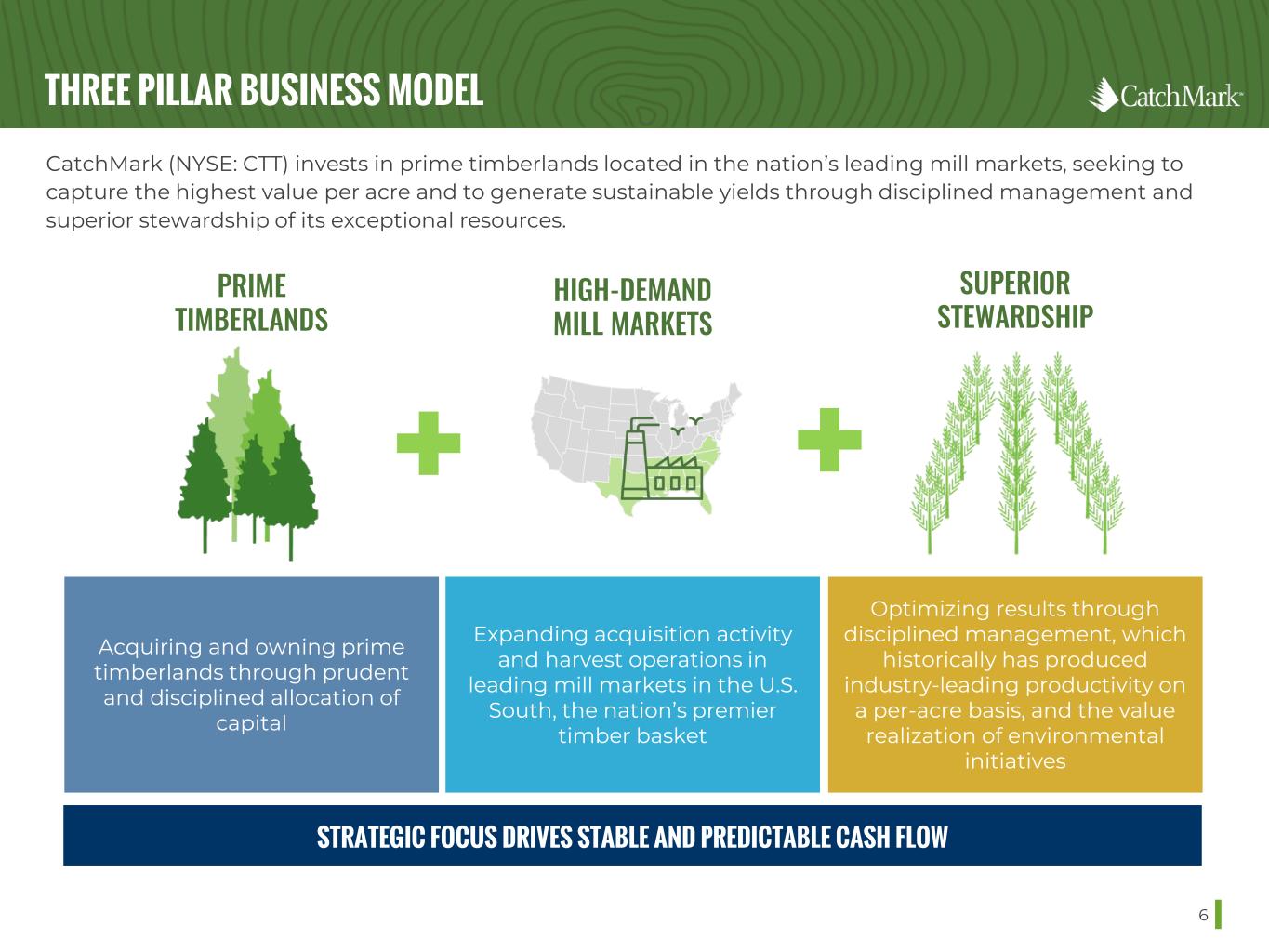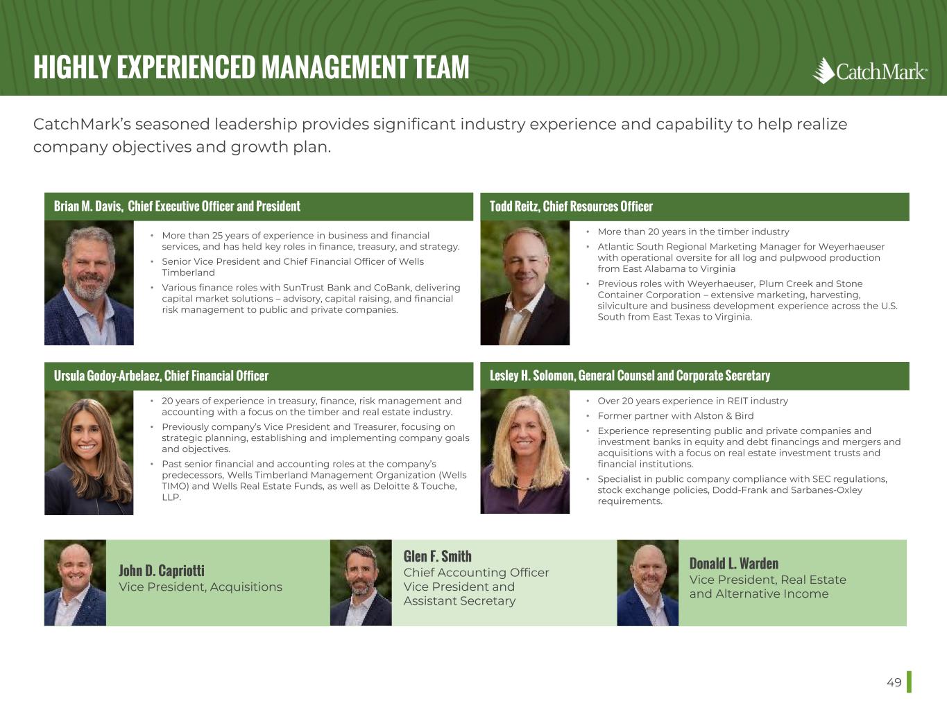THREE PILLAR BUSINESS MODEL 48 PRIME TIMBERLANDS HIGH-DEMAND MILL MARKETS SUPERIOR STEWARDSHIP Acquiring and owning prime timberlands through prudent and disciplined allocation of capital Expanding acquisition activity and harvest operations in leading mill markets in the U.S. South, the nation’s premier timber basket Optimizing results through disciplined management, which historically has produced industry-leading productivity on a per-acre basis, and the value realization of environmental initiatives STRATEGIC FOCUS DRIVES STABLE AND PREDICTABLE CASH FLOW CatchMark (NYSE: CTT) invests in prime timberlands located in the nation’s leading mill markets, seeking to capture the highest value per acre and to generate sustainable yields through disciplined management and superior stewardship of its exceptional resources.