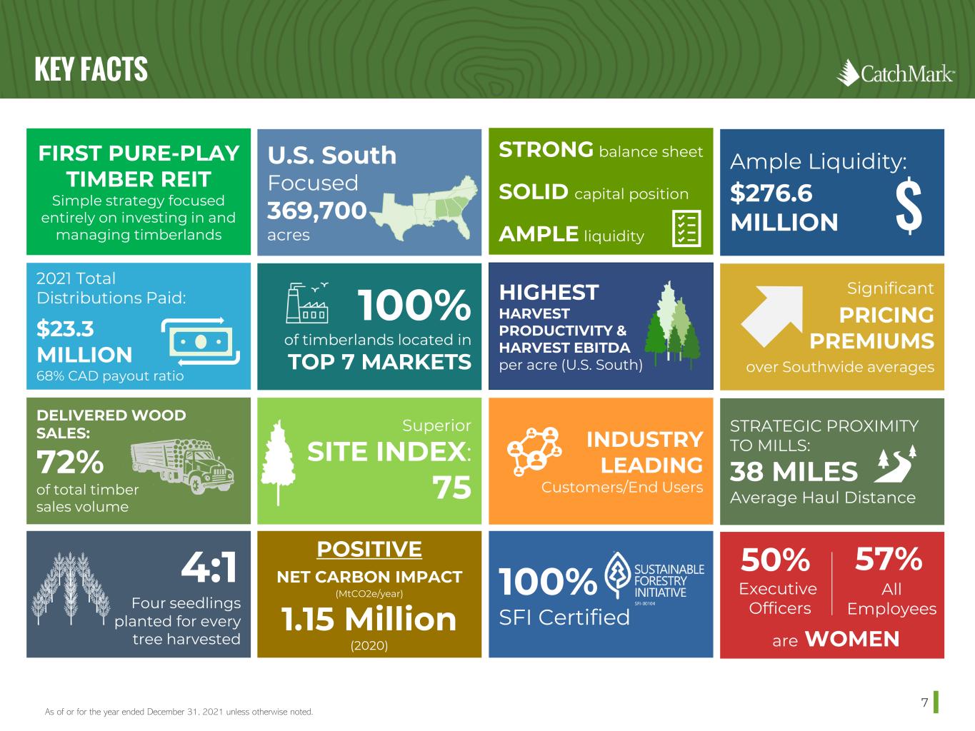THREE PILLAR BUSINESS MODEL 6 PRIME TIMBERLANDS HIGH-DEMAND MILL MARKETS SUPERIOR STEWARDSHIP Acquiring and owning prime timberlands through prudent and disciplined allocation of capital Expanding acquisition activity and harvest operations in leading mill markets in the U.S. South, the nation’s premier timber basket Optimizing results through disciplined management, which historically has produced industry-leading productivity on a per-acre basis, and the value realization of environmental initiatives STRATEGIC FOCUS DRIVES STABLE AND PREDICTABLE CASH FLOW CatchMark (NYSE: CTT) invests in prime timberlands located in the nation’s leading mill markets, seeking to capture the highest value per acre and to generate sustainable yields through disciplined management and superior stewardship of its exceptional resources.