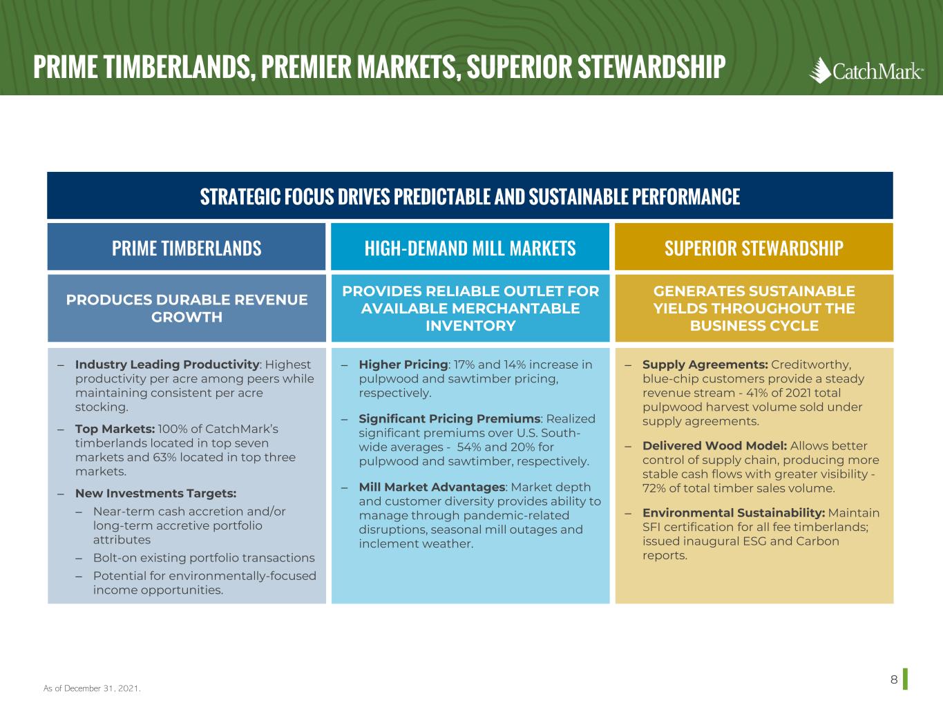 KEY FACTS 7 As of or for the year ended December 31, 2021 unless otherwise noted. U.S. South Focused 369,700 acres 2021 Total Distributions Paid: $23.3 MILLION 68% CAD payout ratio HIGHEST HARVEST PRODUCTIVITY & HARVEST EBITDA per acre (U.S. South) 100% of timberlands located in TOP 7 MARKETS STRONG balance sheet SOLID capital position AMPLE liquidity DELIVERED WOOD SALES: 72% of total timber sales volume POSITIVE NET CARBON IMPACT (MtCO2e/year) 1.15 Million (2020) INDUSTRY LEADING Customers/End Users FIRST PURE-PLAY TIMBER REIT Simple strategy focused entirely on investing in and managing timberlands 4:1 Four seedlings planted for every tree harvested Superior SITE INDEX: 75 100% SFI Certified Significant PRICING PREMIUMS over Southwide averages STRATEGIC PROXIMITY TO MILLS: 38 MILES Average Haul Distance Ample Liquidity: $276.6 MILLION 50% Executive Officers 57% All Employees are WOMEN $