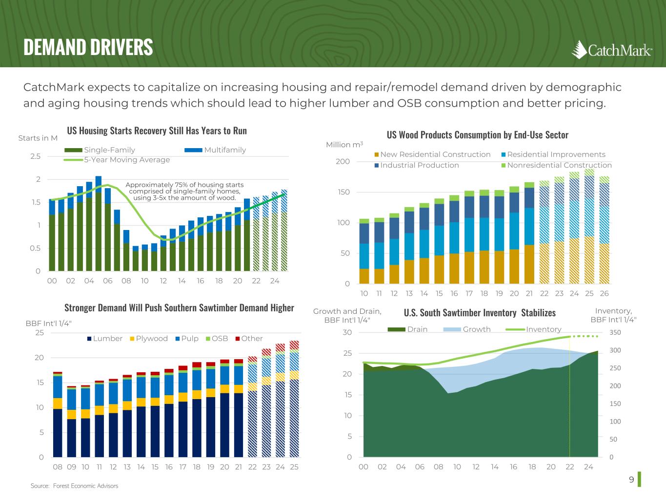 PRIME TIMBERLANDS, PREMIER MARKETS, SUPERIOR STEWARDSHIP 8 PRIME TIMBERLANDS HIGH-DEMAND MILL MARKETS SUPERIOR STEWARDSHIP STRATEGIC FOCUS DRIVES PREDICTABLE AND SUSTAINABLE PERFORMANCE ‒ Industry Leading Productivity: Highest productivity per acre among peers while maintaining consistent per acre stocking. ‒ Top Markets: 100% of CatchMark’s timberlands located in top seven markets and 63% located in top three markets. ‒ New Investments Targets: ‒ Near-term cash accretion and/or long-term accretive portfolio attributes ‒ Bolt-on existing portfolio transactions ‒ Potential for environmentally-focused income opportunities. ‒ Higher Pricing: 17% and 14% increase in pulpwood and sawtimber pricing, respectively. ‒ Significant Pricing Premiums: Realized significant premiums over U.S. South- wide averages - 54% and 20% for pulpwood and sawtimber, respectively. ‒ Mill Market Advantages: Market depth and customer diversity provides ability to manage through pandemic-related disruptions, seasonal mill outages and inclement weather. ‒ Supply Agreements: Creditworthy, blue-chip customers provide a steady revenue stream - 41% of 2021 total pulpwood harvest volume sold under supply agreements. ‒ Delivered Wood Model: Allows better control of supply chain, producing more stable cash flows with greater visibility - 72% of total timber sales volume. ‒ Environmental Sustainability: Maintain SFI certification for all fee timberlands; issued inaugural ESG and Carbon reports. PRODUCES DURABLE REVENUE GROWTH PROVIDES RELIABLE OUTLET FOR AVAILABLE MERCHANTABLE INVENTORY GENERATES SUSTAINABLE YIELDS THROUGHOUT THE BUSINESS CYCLE As of December 31, 2021.