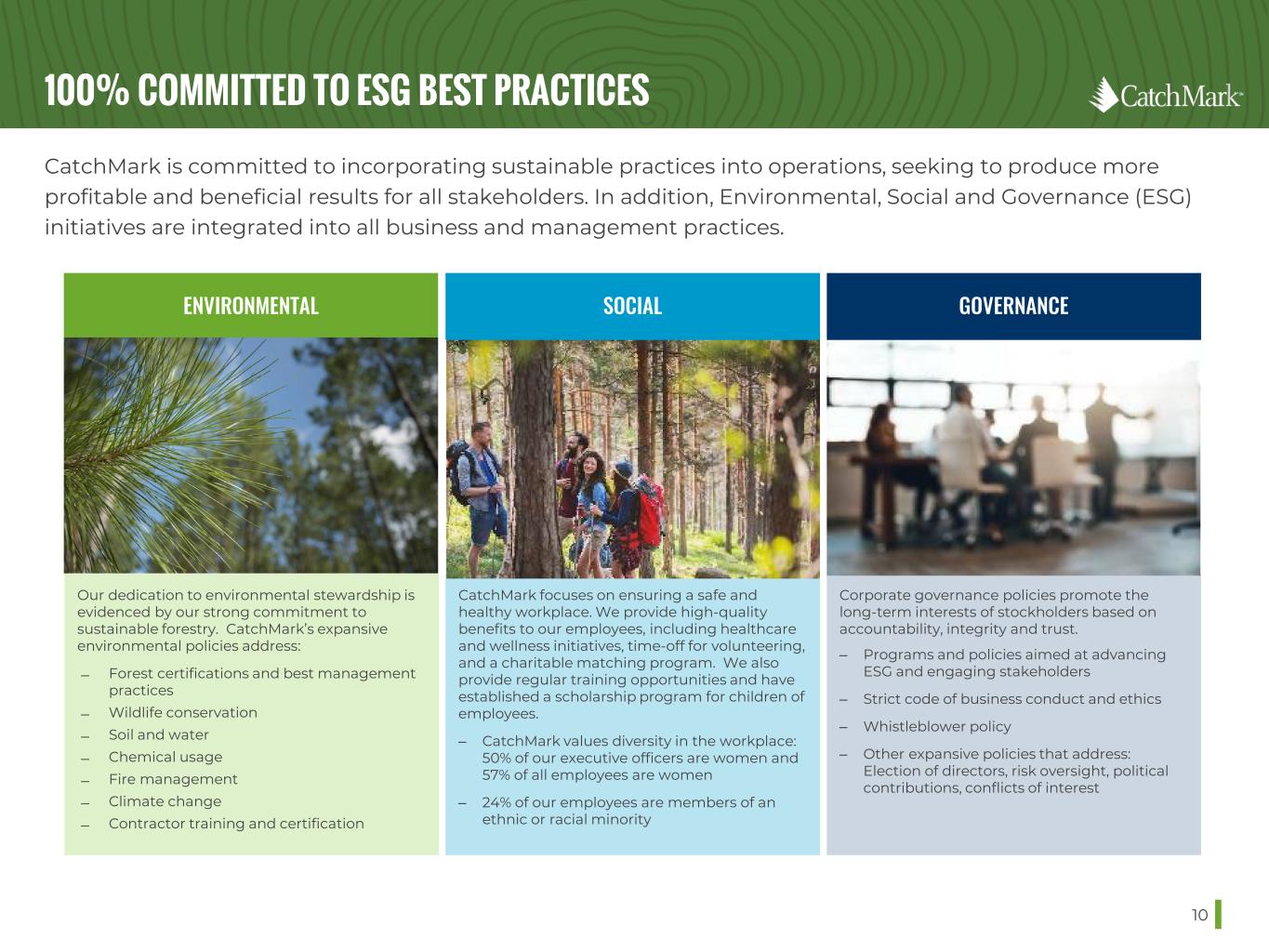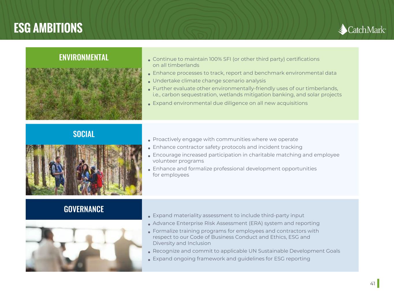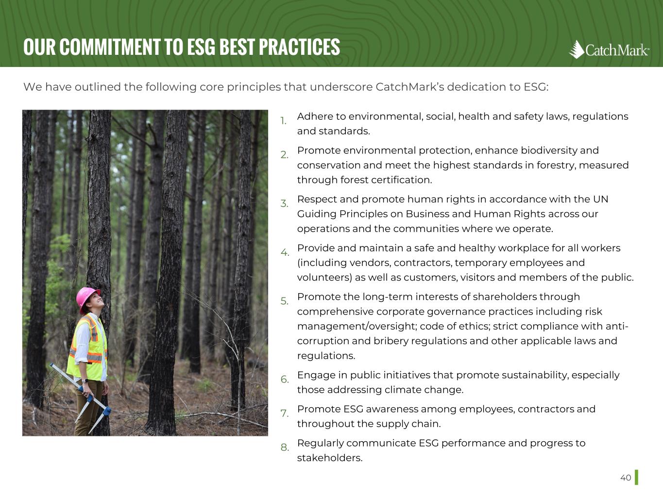 OUR COMMITMENT TO ESG BEST PRACTICES 40 We have outlined the following core principles that underscore CatchMark’s dedication to ESG: 1. Adhere to environmental, social, health and safety laws, regulations and standards. 2. Promote environmental protection, enhance biodiversity and conservation and meet the highest standards in forestry, measured through forest certification. 3. Respect and promote human rights in accordance with the UN Guiding Principles on Business and Human Rights across our operations and the communities where we operate. 4. Provide and maintain a safe and healthy workplace for all workers (including vendors, contractors, temporary employees and volunteers) as well as customers, visitors and members of the public. 5. Promote the long-term interests of shareholders through comprehensive corporate governance practices including risk management/oversight; code of ethics; strict compliance with anti- corruption and bribery regulations and other applicable laws and regulations. 6. Engage in public initiatives that promote sustainability, especially those addressing climate change. 7. Promote ESG awareness among employees, contractors and throughout the supply chain. 8. Regularly communicate ESG performance and progress to stakeholders.