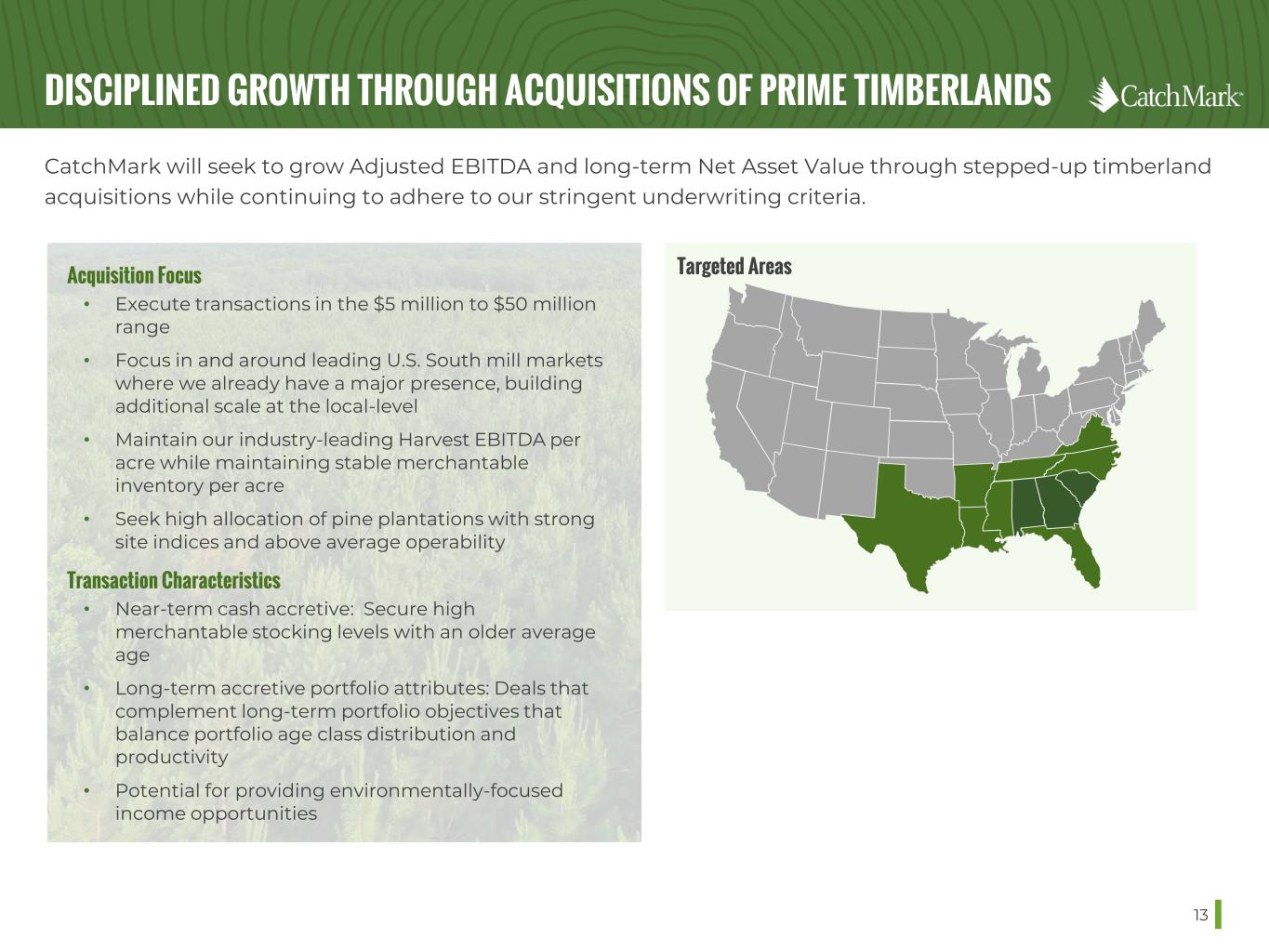 STRATEGIC PRIORITIES 12 CatchMark is focused on our tested and proven business model with a clear track to generate long-term growth. DISCIPLINED ACQUISITIONS OF PRIME TIMBERLANDS • Grow Adjusted EBITDA and long-term NAV through stepped-up timberland acquisitions while continuing to adhere to our stringent underwriting criteria. ENVIRONMENTAL INITIATIVES • Recognizing the key role that forests play in protecting the environment, seek environmentally-focused income opportunities ‒ Carbon sequestration ‒ Wetlands mitigation banking ‒ Solar projects