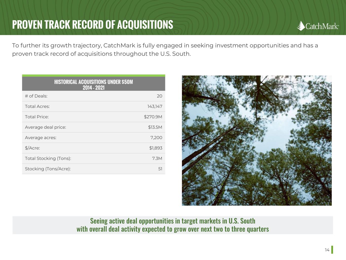 DISCIPLINED GROWTH THROUGH ACQUISITIONS OF PRIME TIMBERLANDS 13 CatchMark will seek to grow Adjusted EBITDA and long-term Net Asset Value through stepped-up timberland acquisitions while continuing to adhere to our stringent underwriting criteria. Targeted AreasAcquisition Focus • Execute transactions in the $5 million to $50 million range • Focus in and around leading U.S. South mill markets where we already have a major presence, building additional scale at the local-level • Maintain our industry-leading Harvest EBITDA per acre while maintaining stable merchantable inventory per acre • Seek high allocation of pine plantations with strong site indices and above average operability Transaction Characteristics • Near-term cash accretive: Secure high merchantable stocking levels with an older average age • Long-term accretive portfolio attributes: Deals that complement long-term portfolio objectives that balance portfolio age class distribution and productivity • Potential for providing environmentally-focused income opportunities