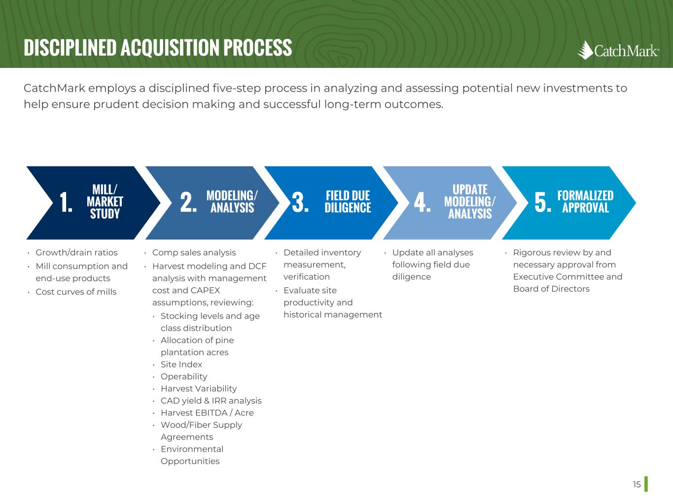 PROVEN TRACK RECORD OF ACQUISITIONS 14 To further its growth trajectory, CatchMark is fully engaged in seeking investment opportunities and has a proven track record of acquisitions throughout the U.S. South. HISTORICAL ACQUISITIONS UNDER $50M 2014 – 2021 # of Deals: 20 Total Acres: 143,147 Total Price: $270.9M Average deal price: $13.5M Average acres: 7,200 $/Acre: $1,893 Total Stocking (Tons): 7.3M Stocking (Tons/Acre): 51 Seeing active deal opportunities in target markets in U.S. South with overall deal activity expected to grow over next two to three quarters